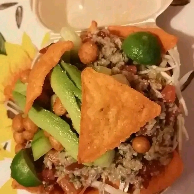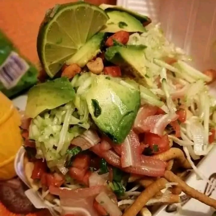Dorilokos granel de cueritos ( lleva col, pico de gallo, pepino , zanahoria, cacahuate y aguacate