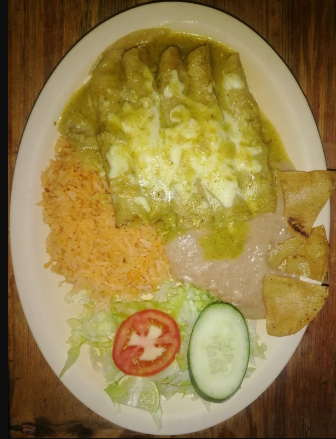 Bistek asado, 2 enchiladas rojas papas a la francesa. Incluye una entrada, tortillas, arroz, frijoles refritos, ensalada y salsa picante.