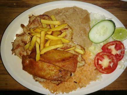 Incluye una entrada y un guisado acompañado de arroz, frijoles refritos, ensalada, tortillas y salsa picante.
