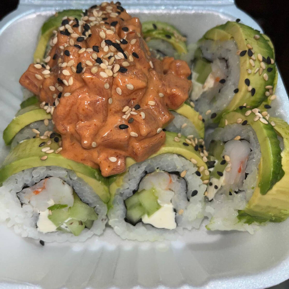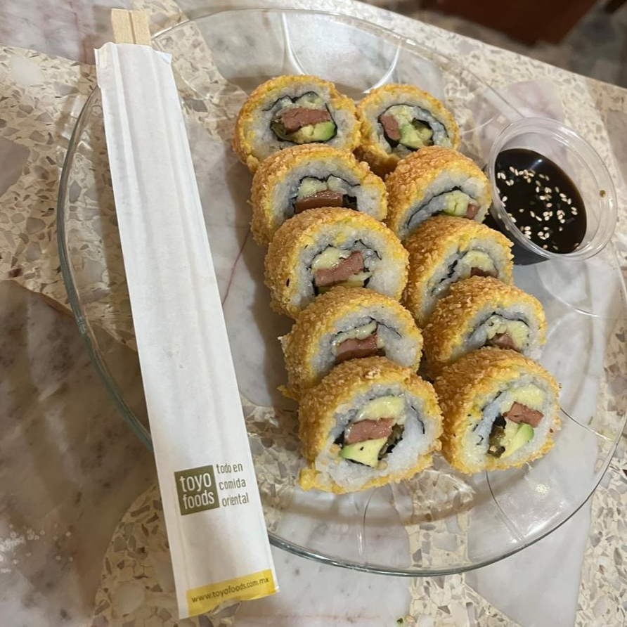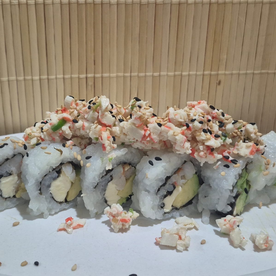 Camarón empanizado, aderezo tampico y queso crema. Por fuera aguacate, ajonjolí y aderezo de chipotle.