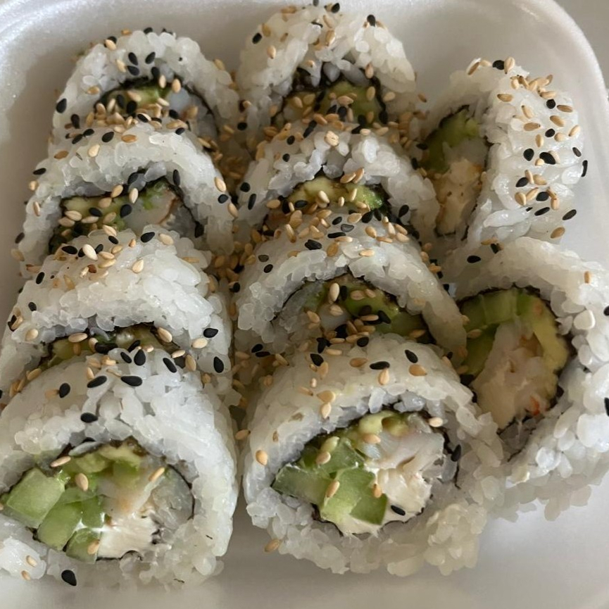 Camarón, pepino, queso crema y aguacate. Por fuera ajonjolí.