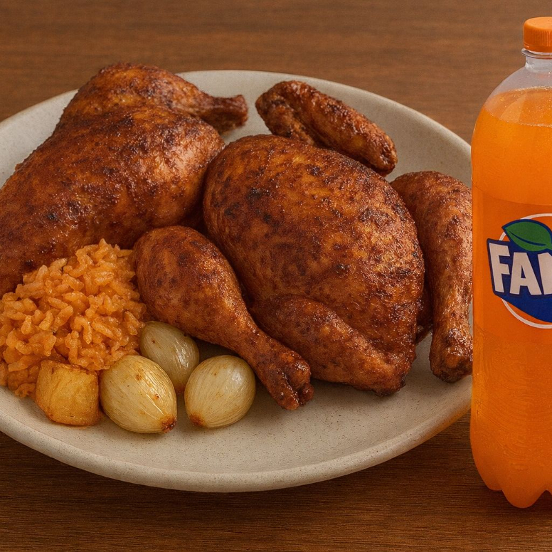 Incluye: Pollo y 1/2, Arroz, Cebollitas, Papas, Salsas y Refresco de 2LT a escoger