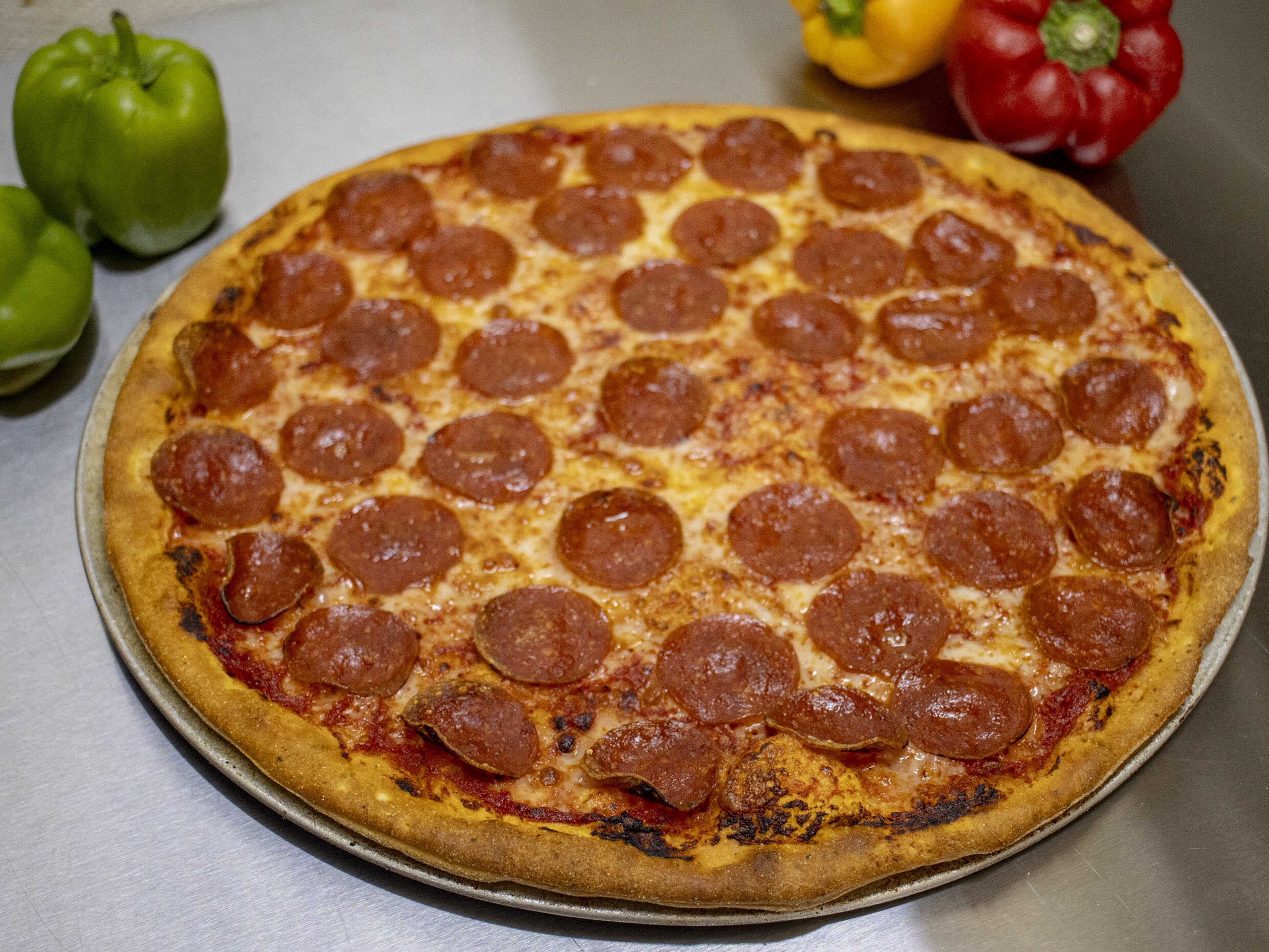Pizza de 35 cm, dividida en 10 rebanadas de pizza 100% artesanal que contiene queso mozzarella y pepperoni.