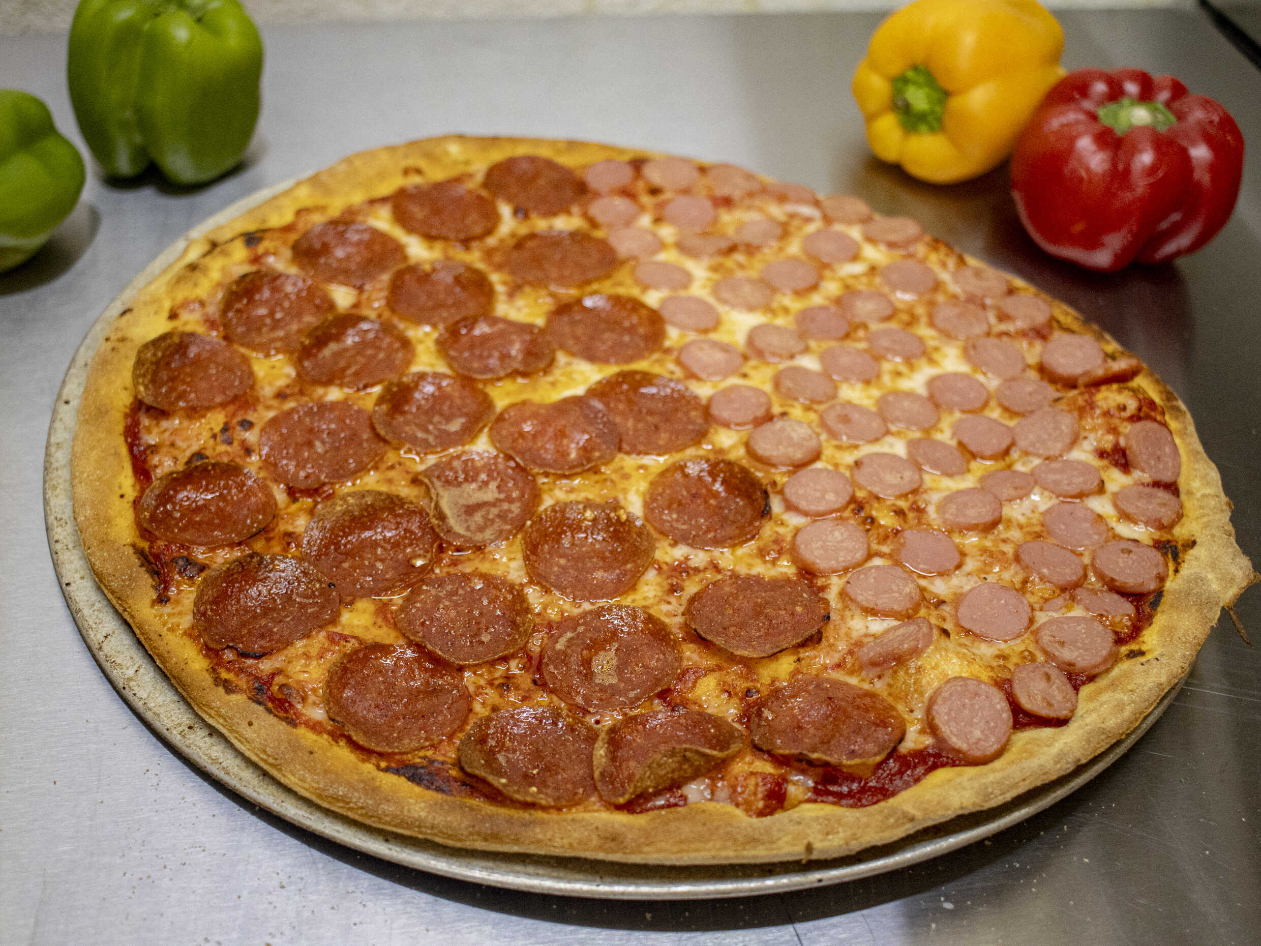 Mitad pepperoni y mitad salchicha.