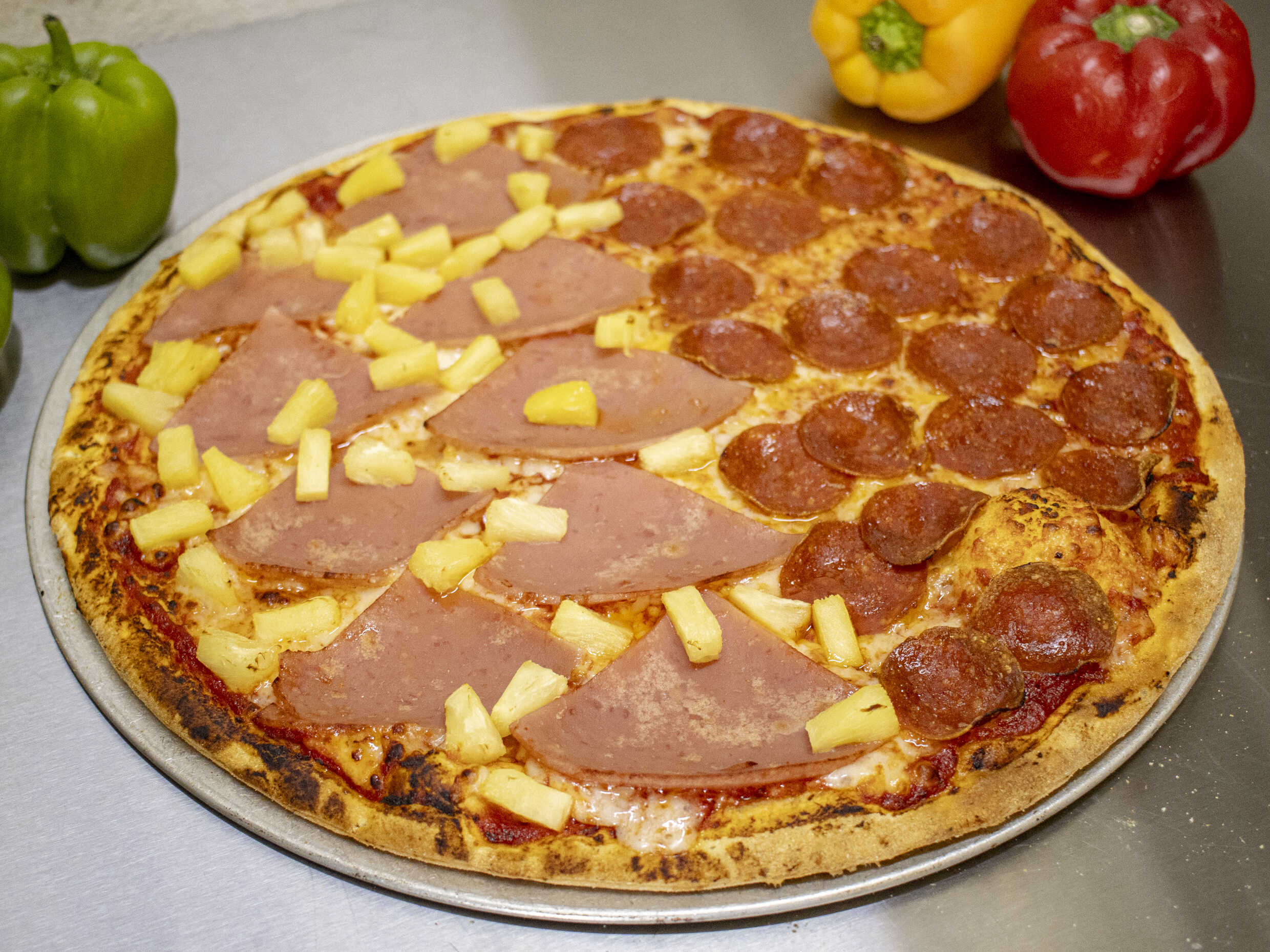 Mitad con jamón, piña y mitad con pepperoni.