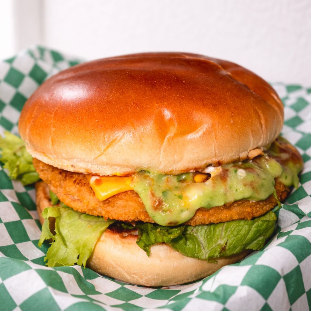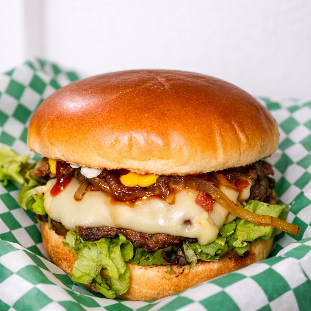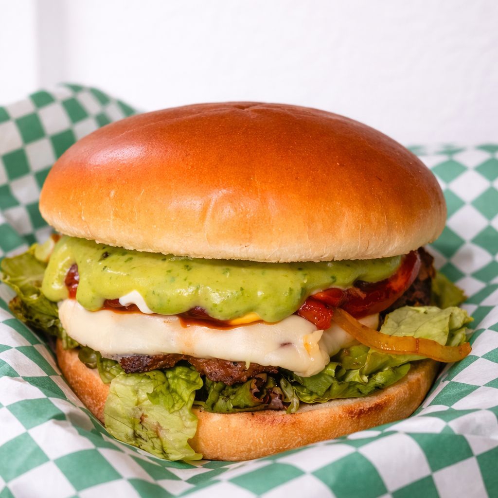 Pan brioche, queso americano, cebollas caramelizadas, tocino, guacamole, aderezos