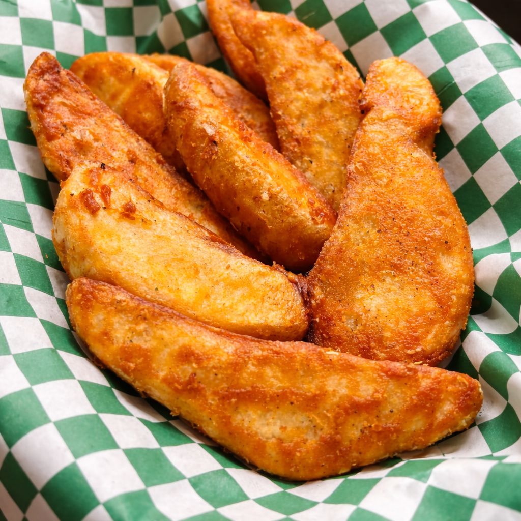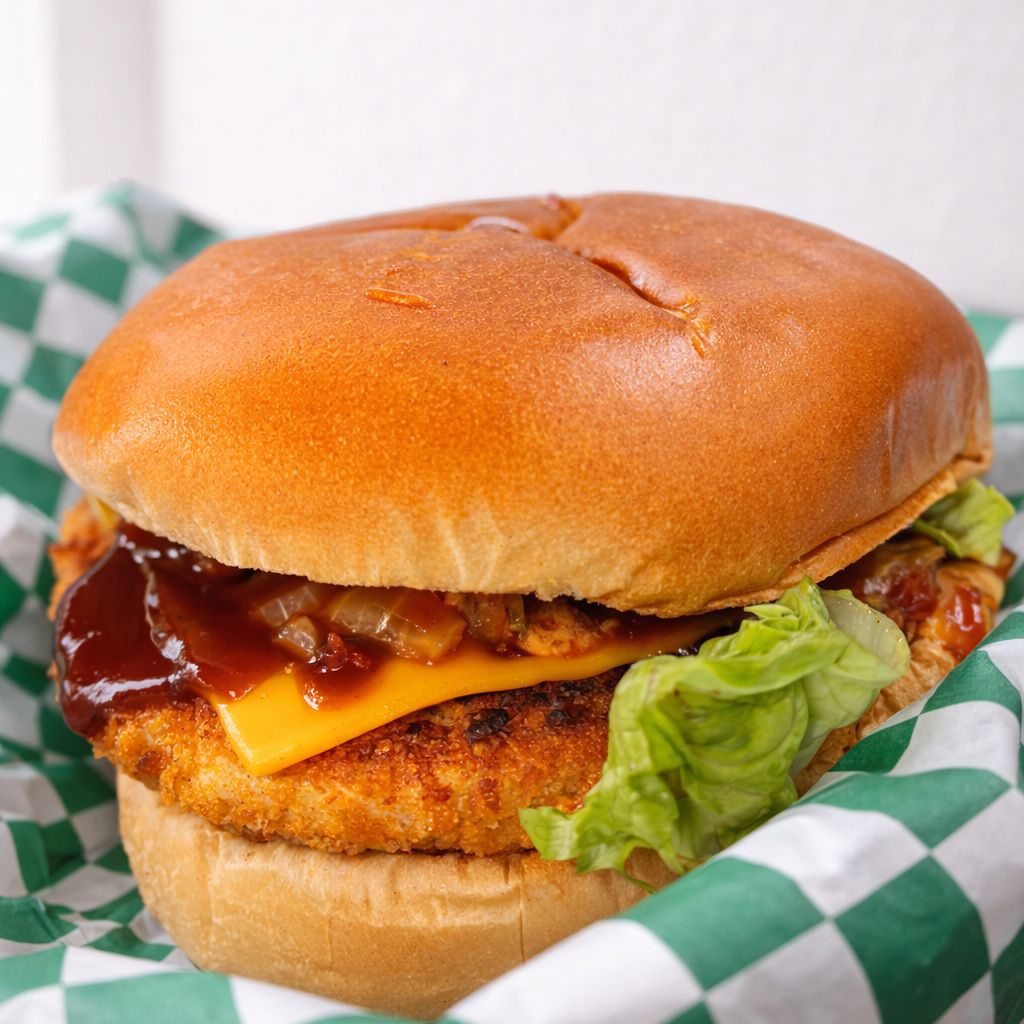 Carne de pollo, queso americano, cebollas caramelizadas, tocino, aderezos, BBQ