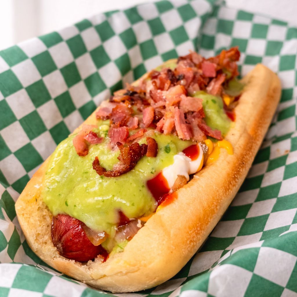 Salchicha de res, cebollas caramelizadas, tocino, aderezos guacamole