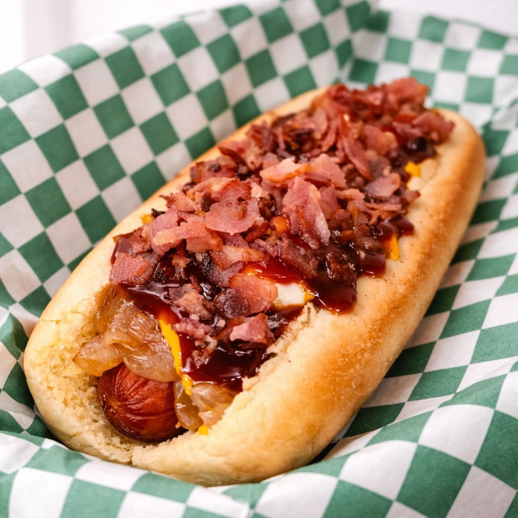 Salchicha de res, cebollas caramelizadas, tocino, aderezos, BBQ
