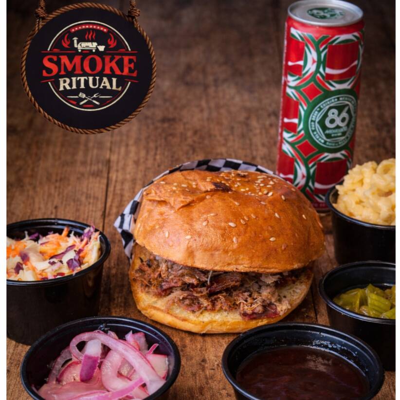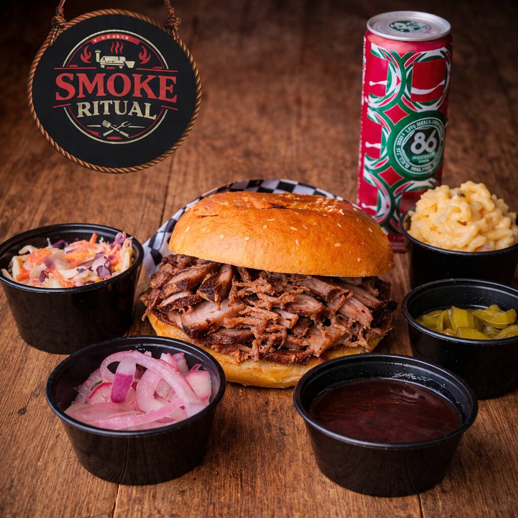 Sandwich Pulled Pork / Brisket (150g), Coleslaw 4 oz, Mac and cheese 4 oz, Coca-Cola 355ml