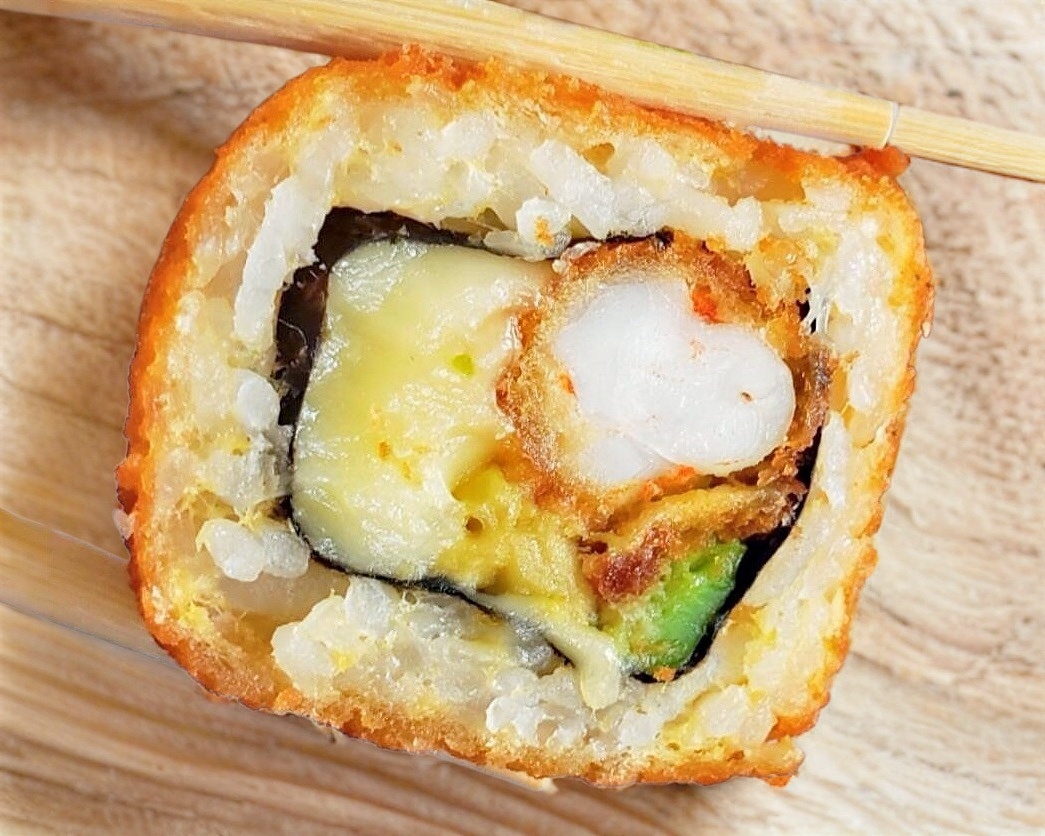Por fuera: alga empanizada, por dentro: aguacate, filadelfia y cangrejo empanizado