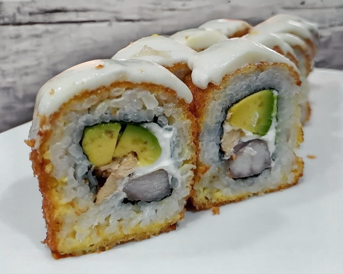 Deléitate con este rollo de 10 bocados, con relleno de camarón empanizado, queso manchego y aguacate. Cada bocado está empanizado y cubierto con una rica salsa chipotle que aporta un toque de picante irresistible.