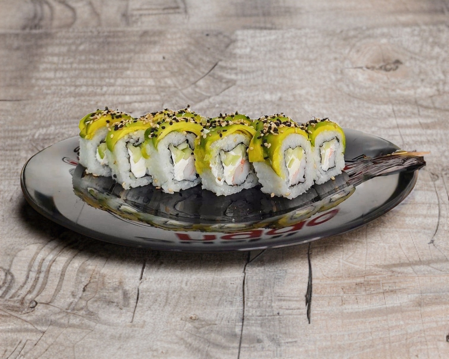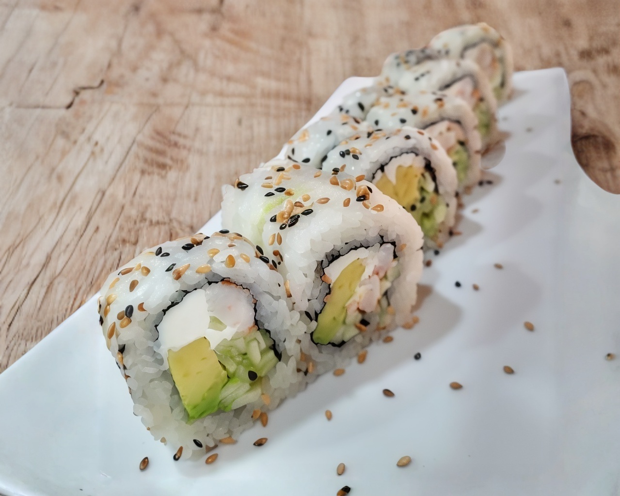 Por fuera: Ajonjolí. Por dentro: Pepino, queso crema, aguacate, cangrejo.