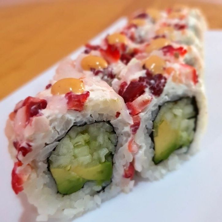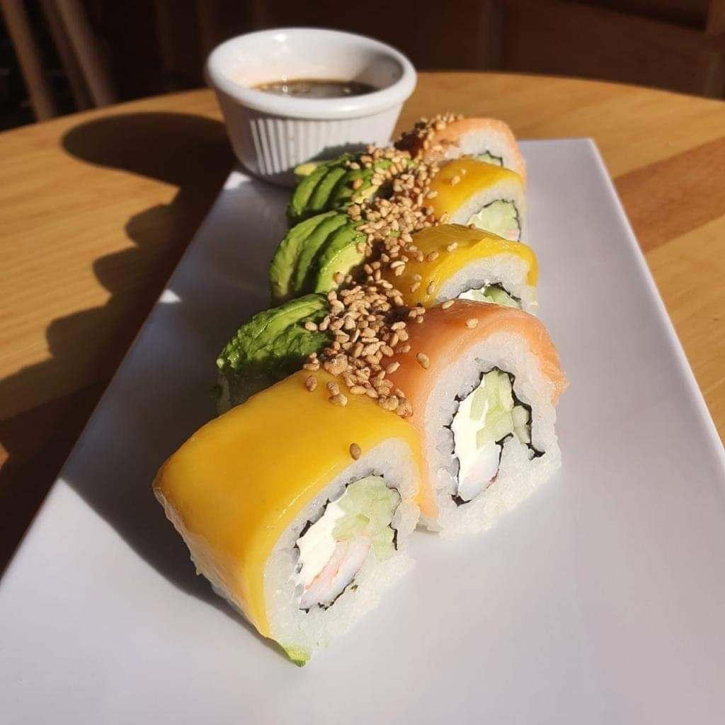 Por dentro: Pepino, queso crema y camarón. Por fuera: Mango/kiwi (disponibilidad temporada), salmón, aguacate y ajonjolí caramelizado.