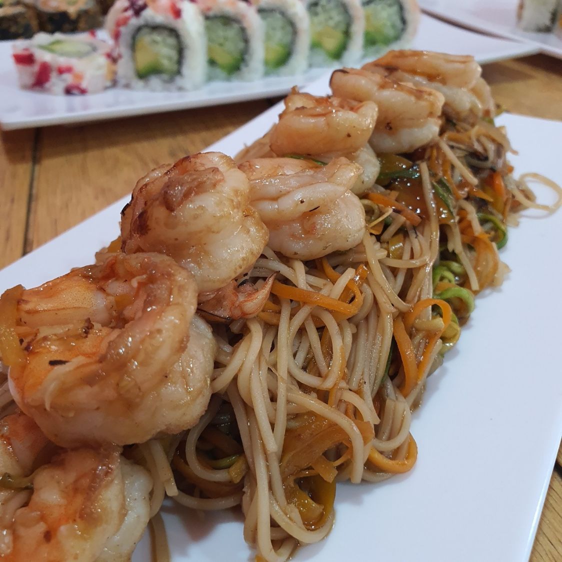 Fideos salteados con verdura, calabaza, cebolla, zanahoria y pimiento, más camarón.