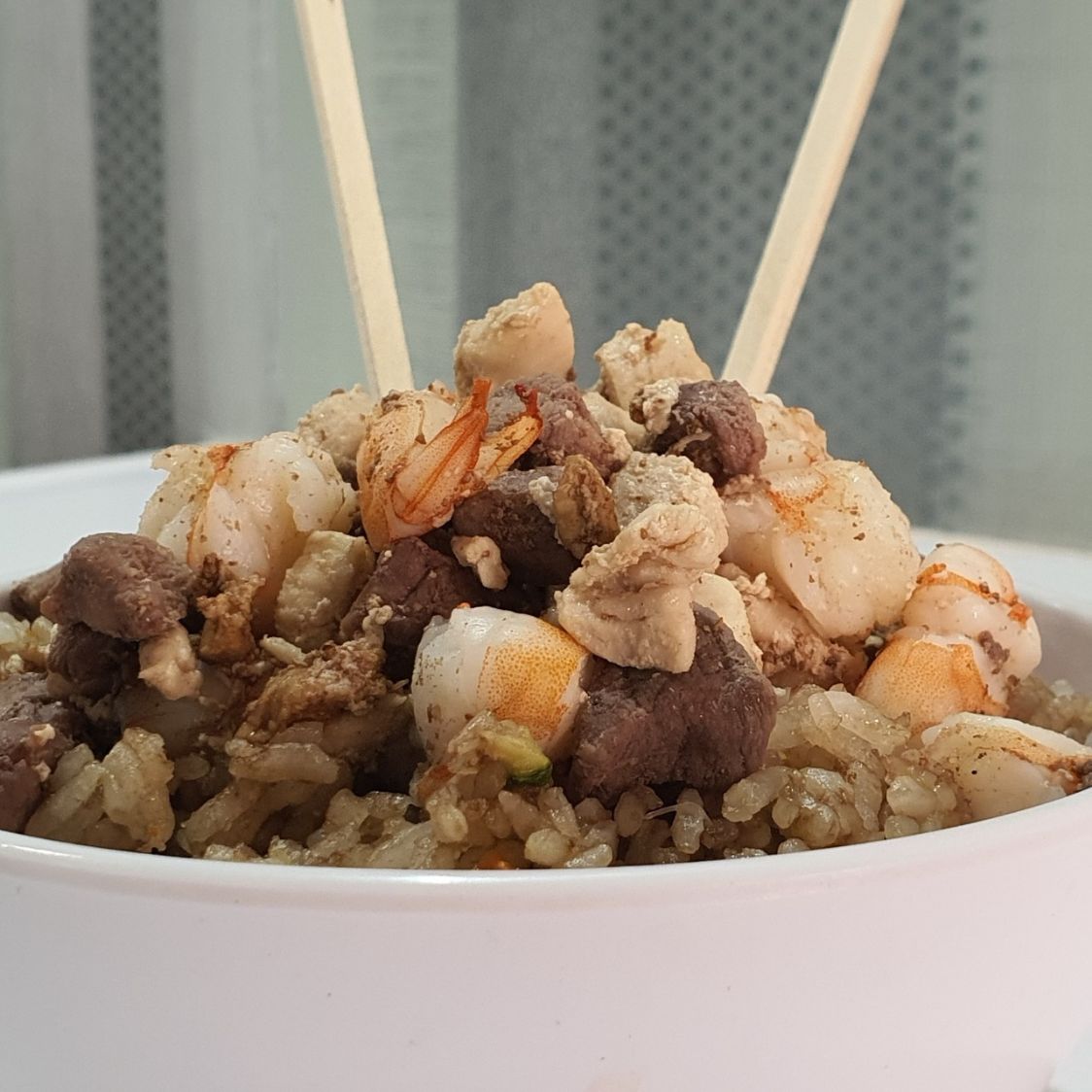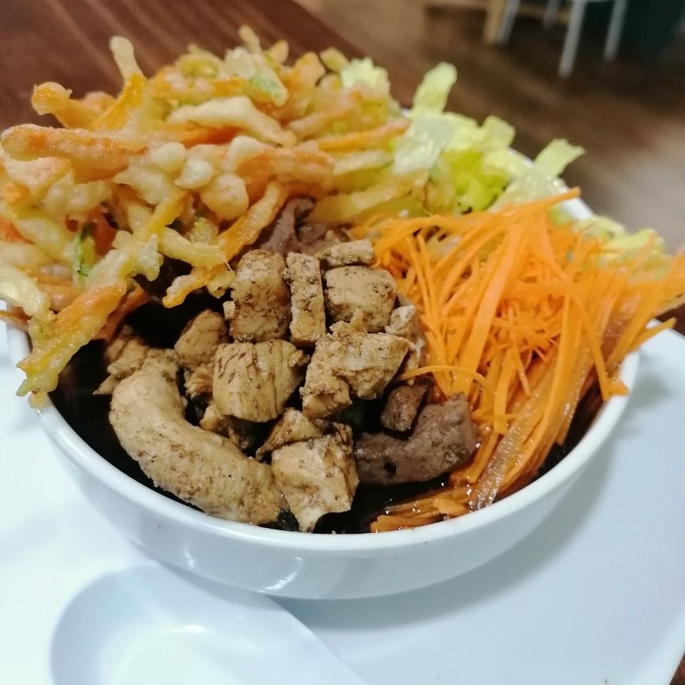 Fideos salteados con verdura, calabaza, cebolla, zanahoria y pimiento, más pollo, res y camarón.