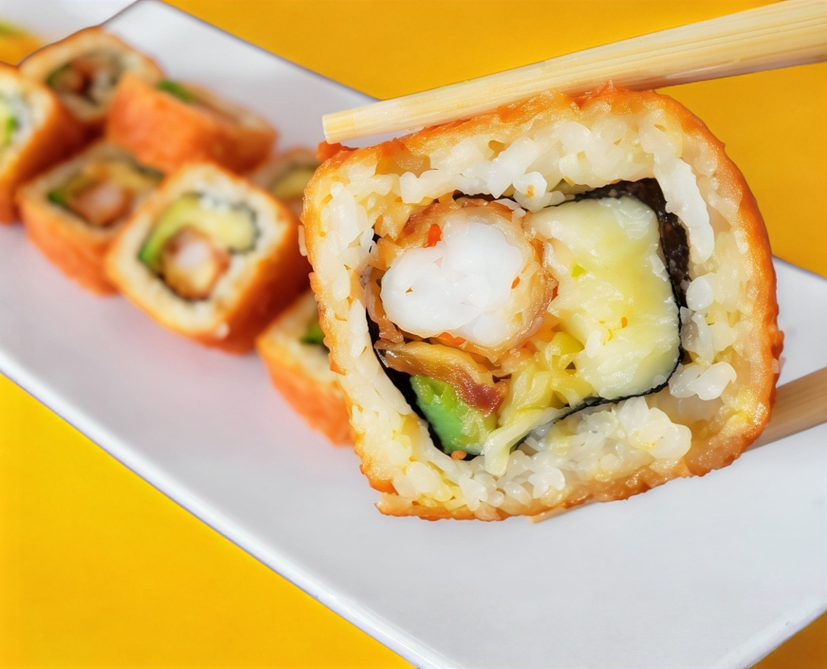 XF: Arroz envuelto en masago XD: Aguacate, queso crema, pepino y atún