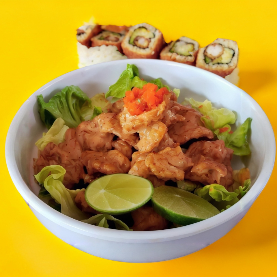 Base de lechuga, pepino, zanahoria, fideo de arroz, aguacate, ajonjolí, vinagre dulce y salmón fresco o a la plancha