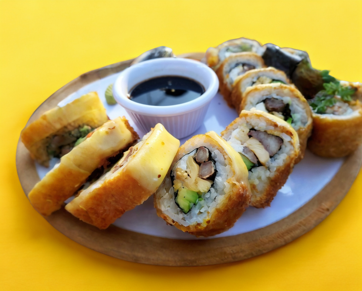 XF: Alga empanizada y salsa lava. XD: Aguacate, filadelfia y cangrejo empanizado.