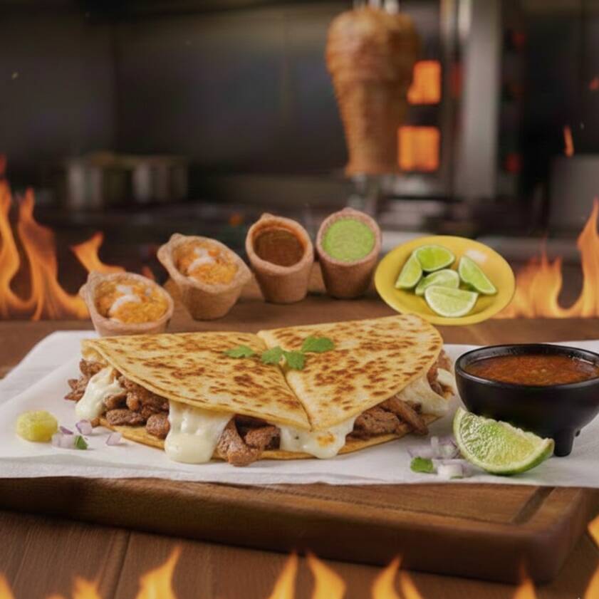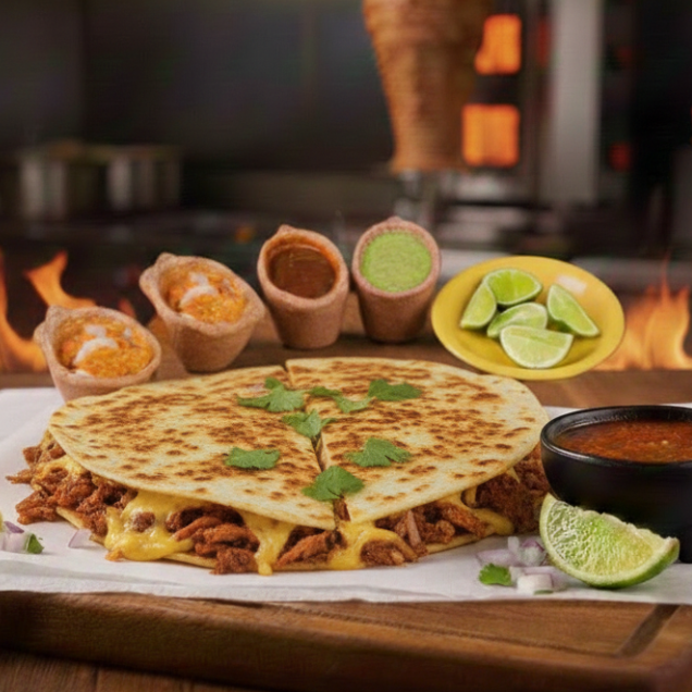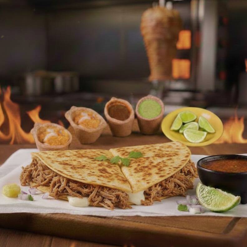 Kilo de pastor acompañado de tortillas, salsa y duritas