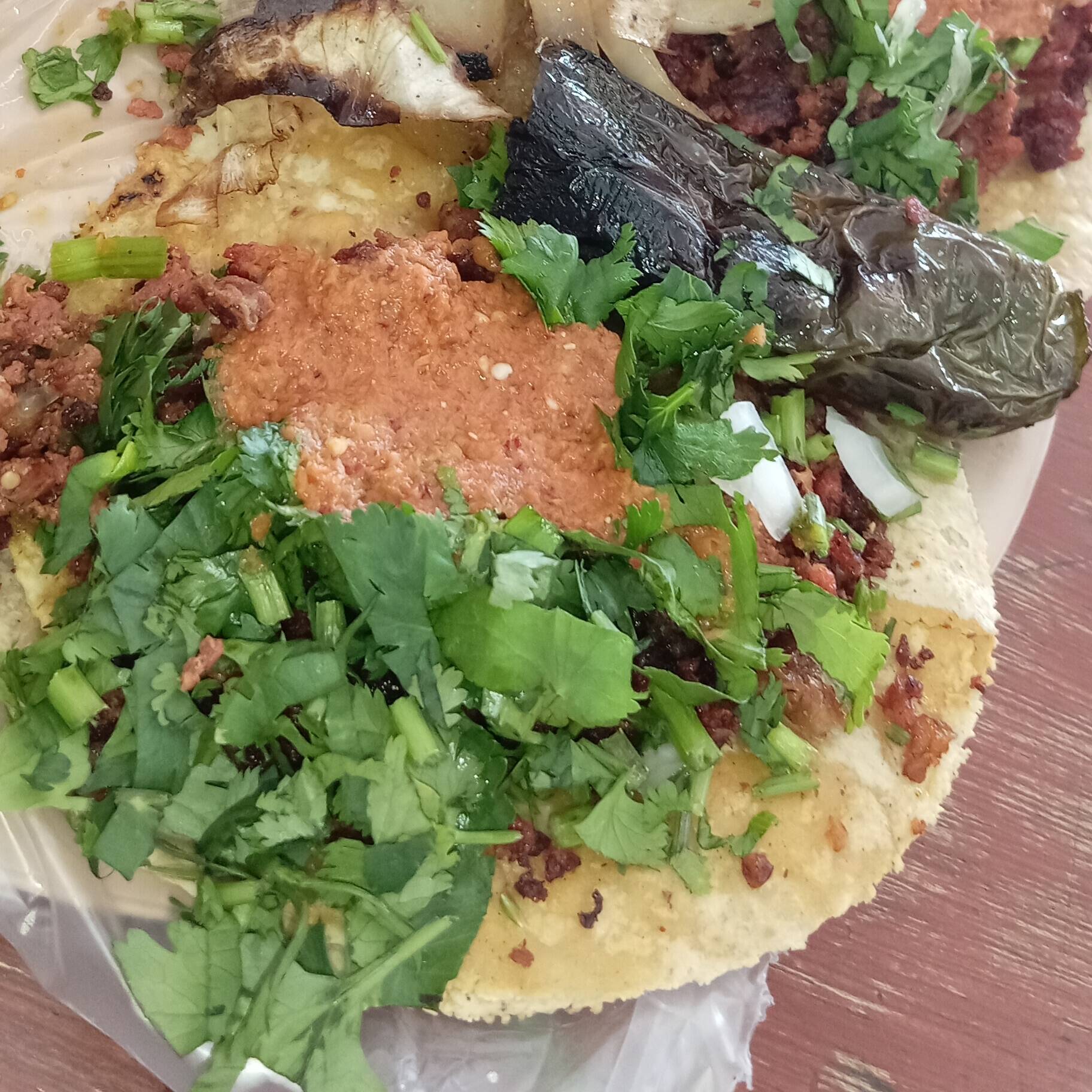 Carne de puerco cabeza y másisa tostadas, chicharrón aguacate, limones lechiga
