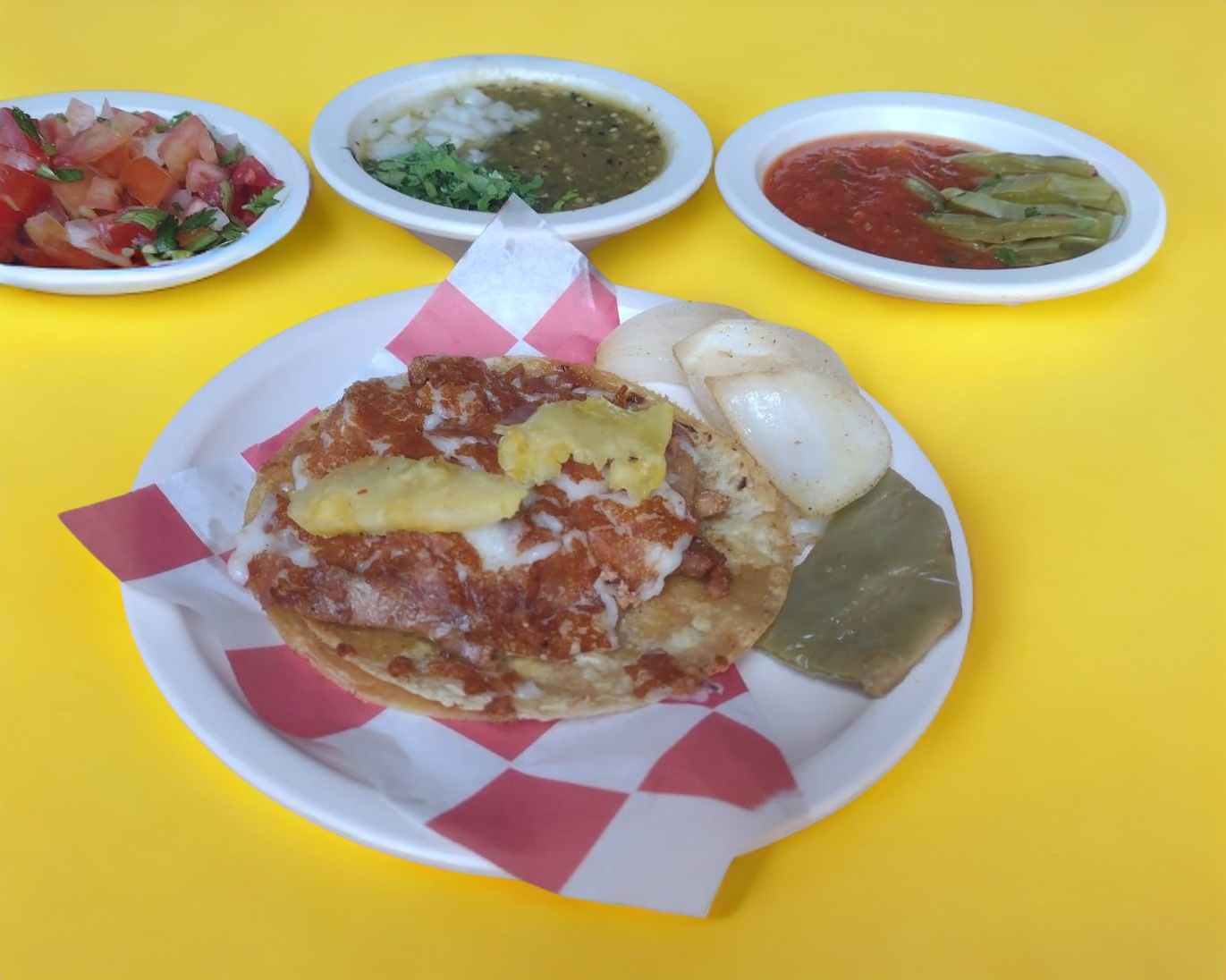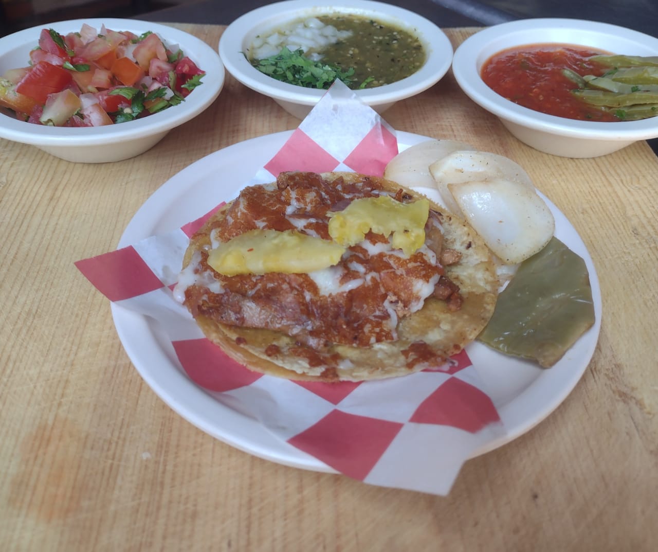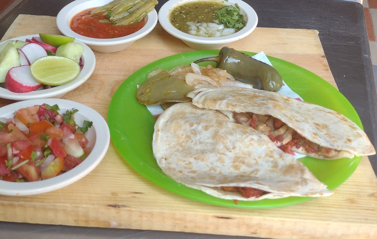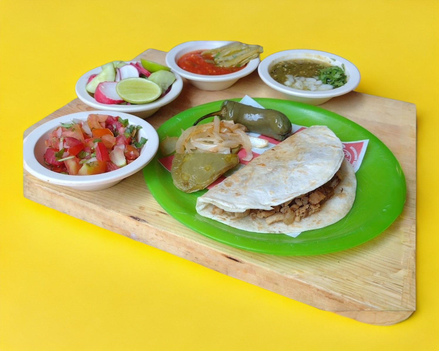 1 Gringa(porcion personal ) Proteína a Elegir(Bistec Alpastor Chorizo Cabeza entre otros ) queso asadero verdura ( cebolla cilantro ) y ensalada de pepino salsa verde y roja aparte
