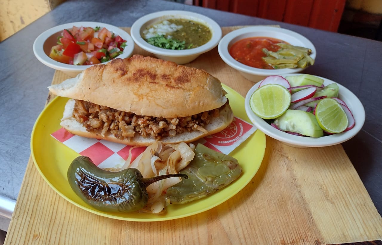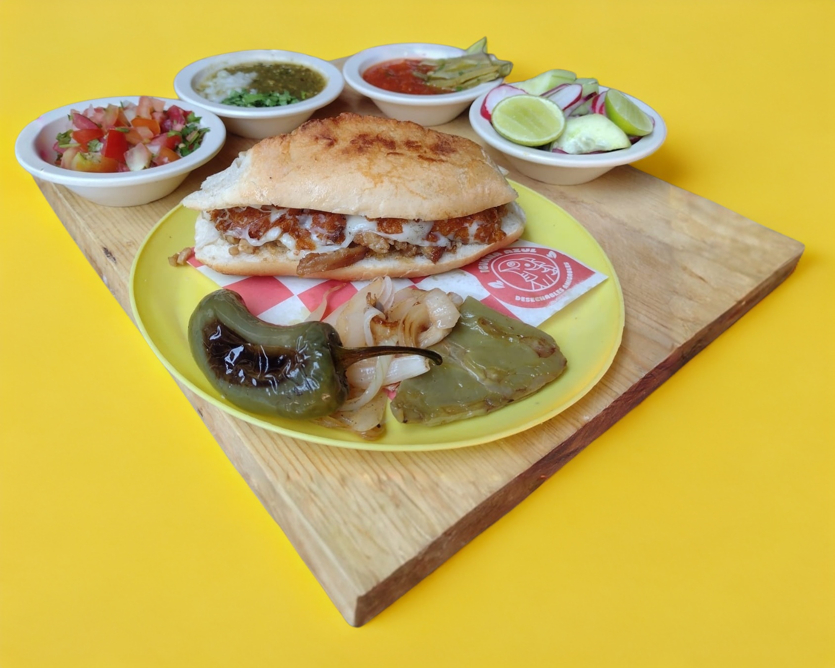 Combo para 1 persona de 1 torta, 2 tacos a base tortilla de harina de maíz acompañados de verdura (cilantro, cebolla y ensalada de pepinos) , ensalada del día : pepino rábano y lechuga, salsas y 2 rodajas de limón ; 1 refresco de 355ml