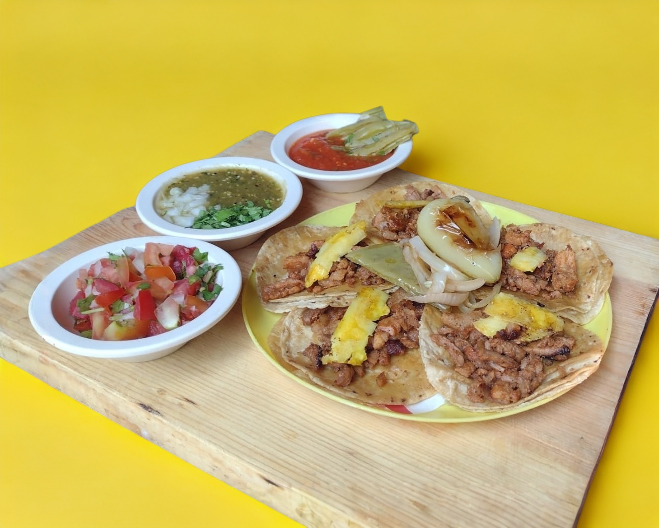 Orden de 5 tacos con tortilla de maíz con proteína a elección (25 g c/u), acompañados de salsas (verde y roja), verduras (cilantro y cebolla) y ensalada (pepino, rábanos y lechuga)