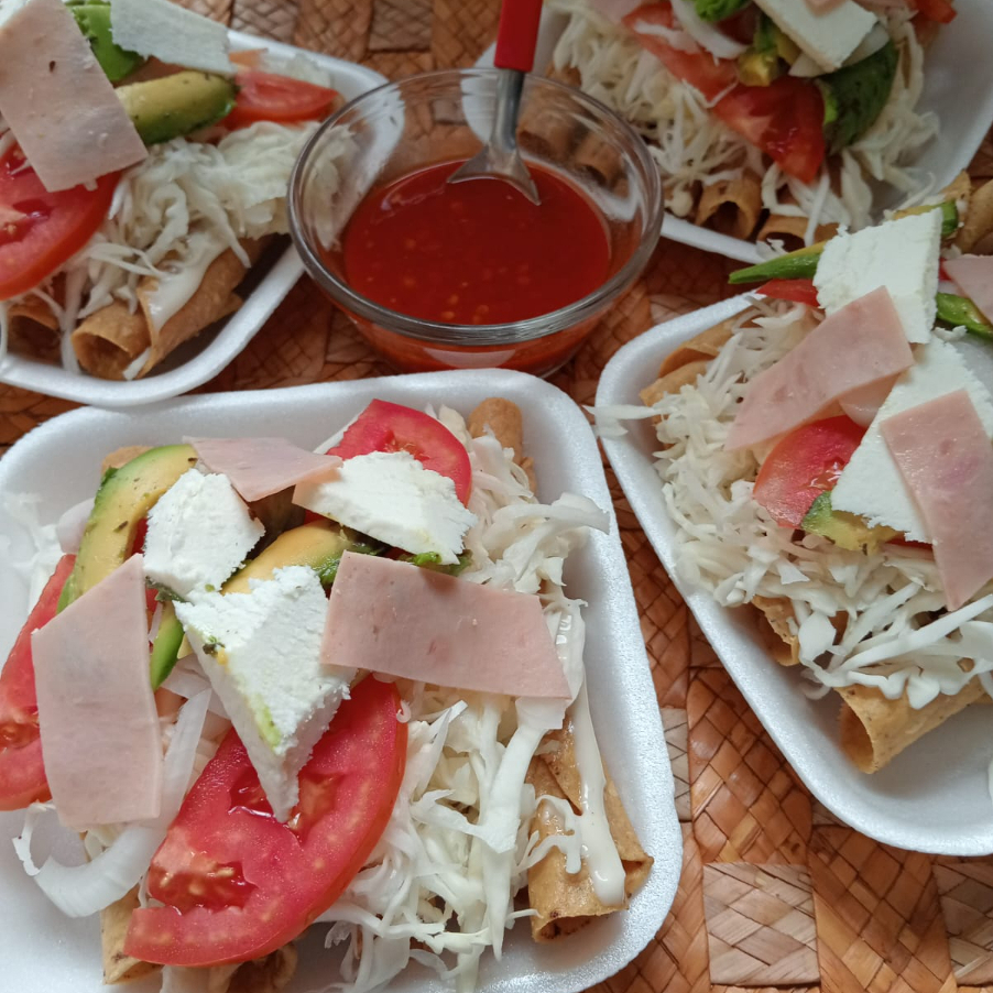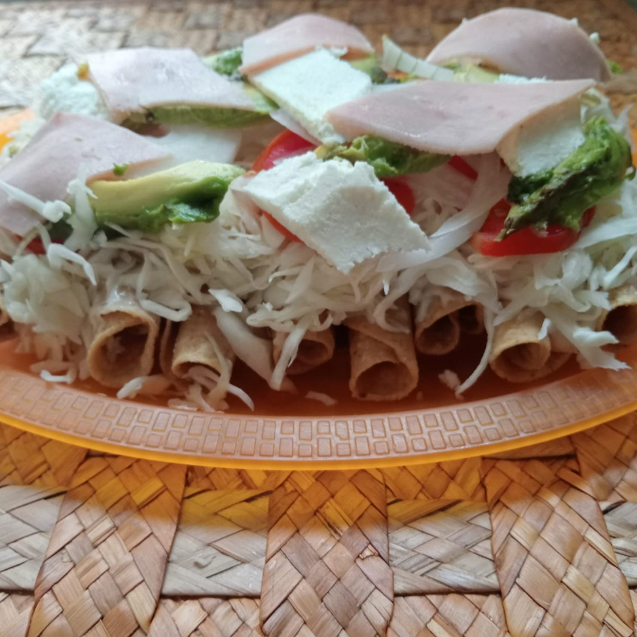 ORDEN DE 5 TACOS DORADOS, MAYONESA,COL, JITOMATE, CEBOLLA, AGUACATE,QUESO BLANCO,JAMON,SALSA ROJA DE ÁRBOL
