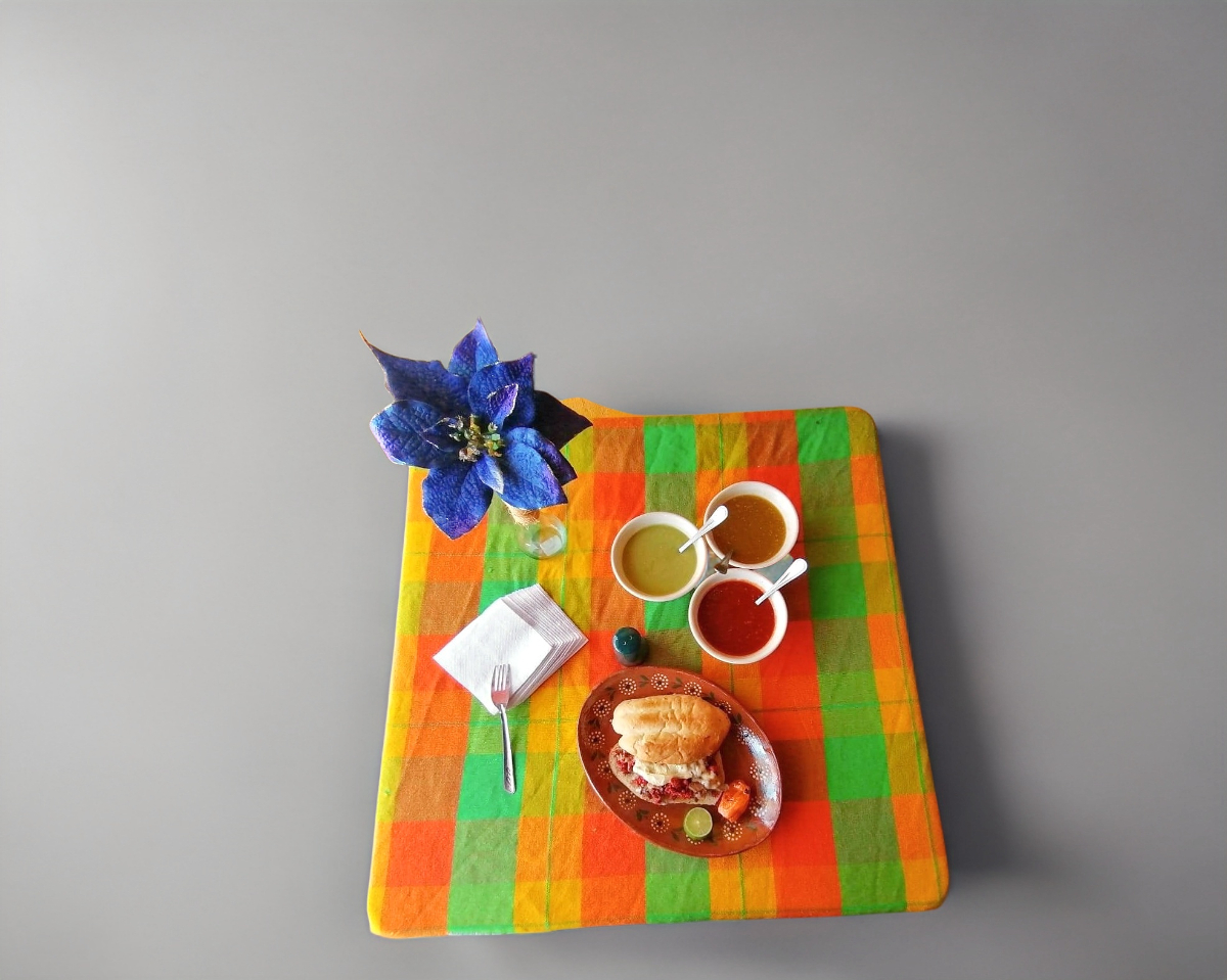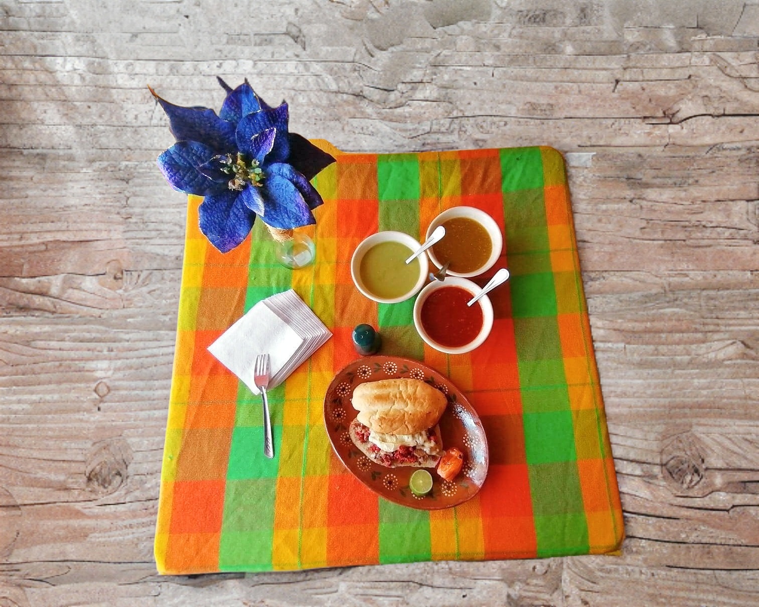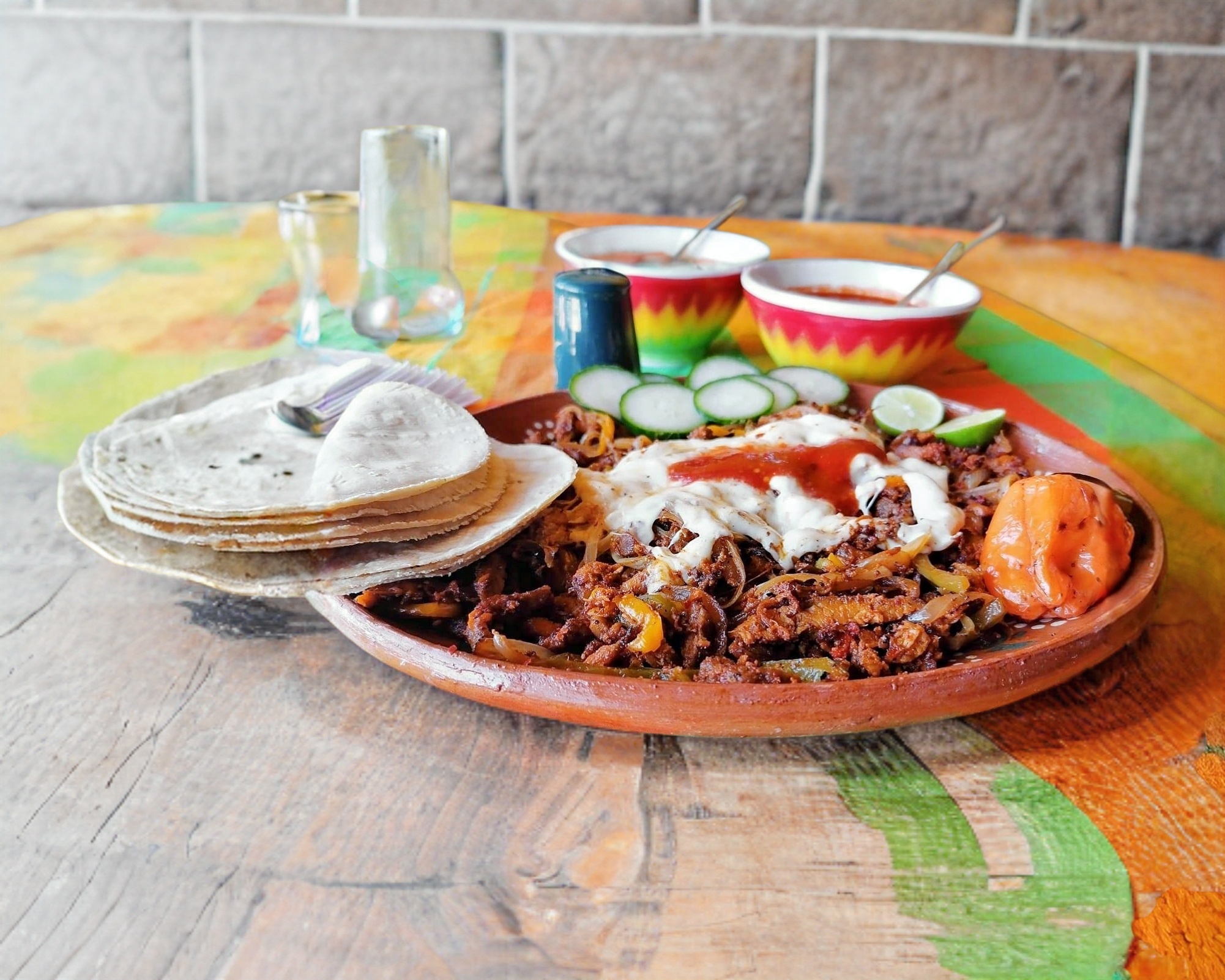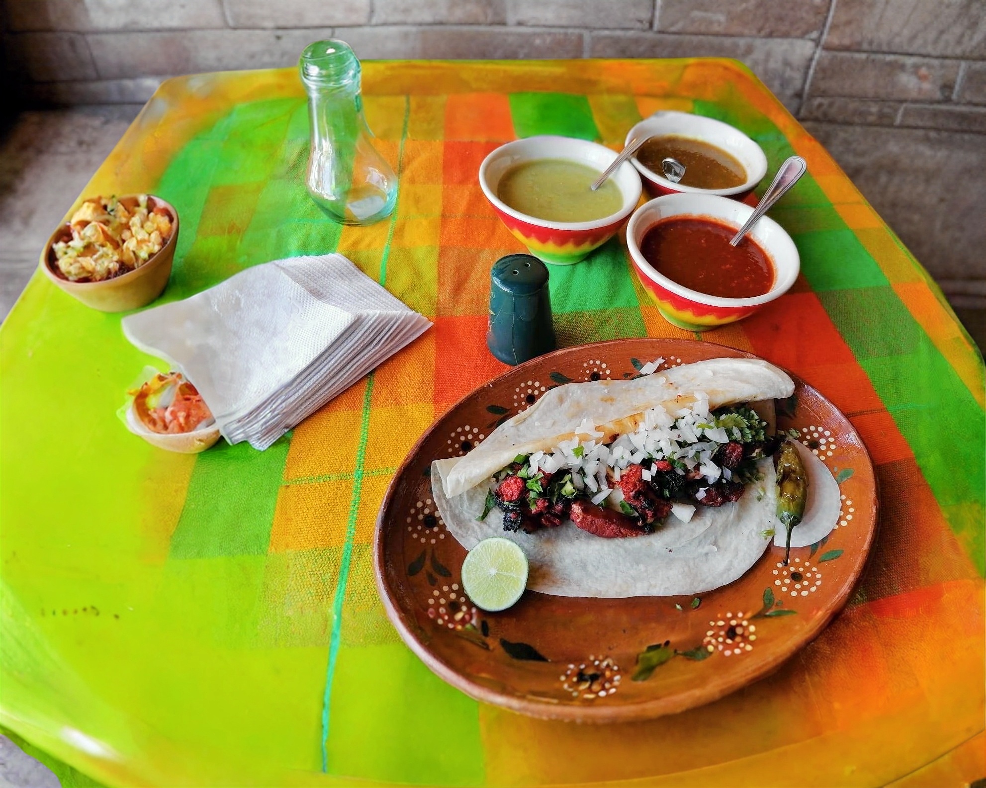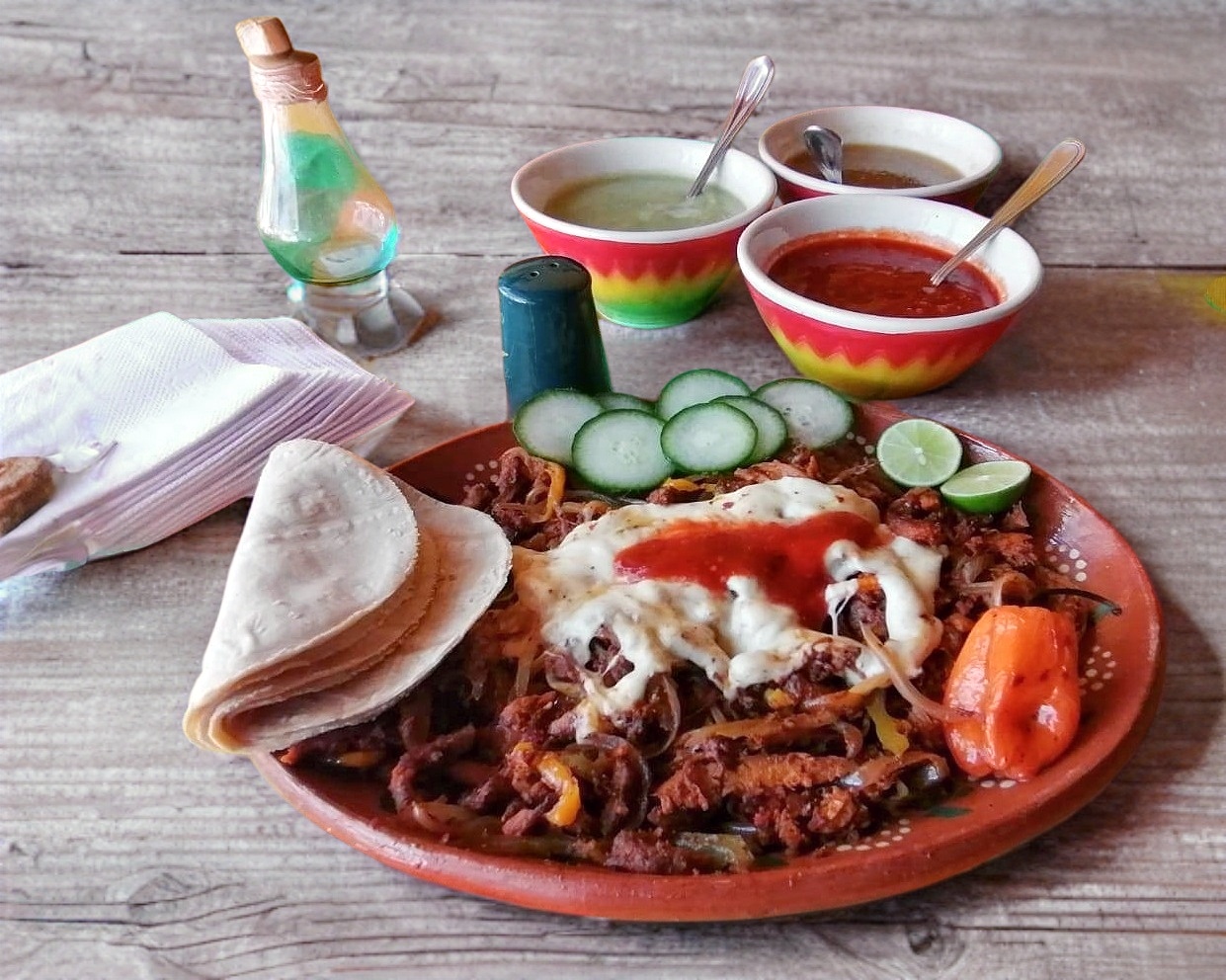 pimiento morron, cebolla asada, queso,tortillas de maiz,salsa verde o roja o guacamole, limones