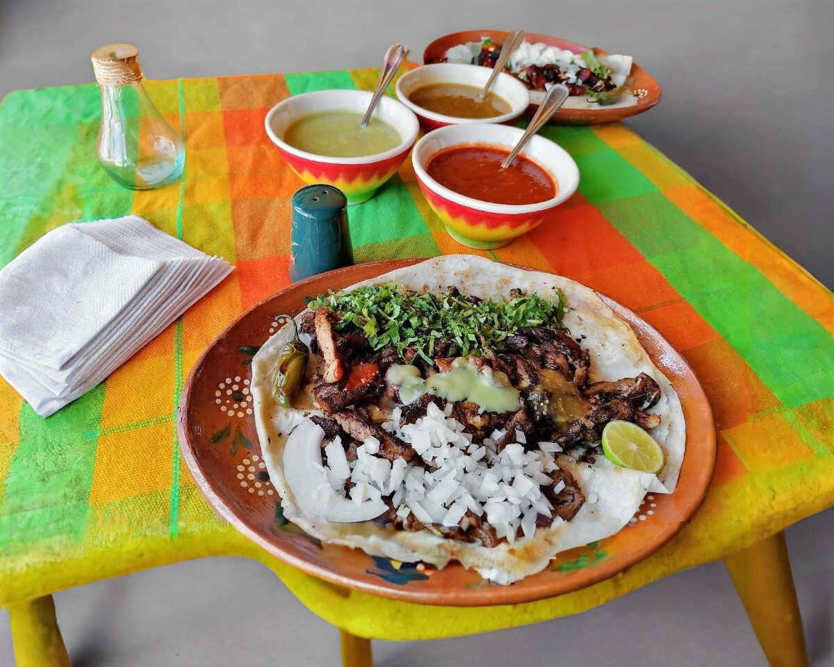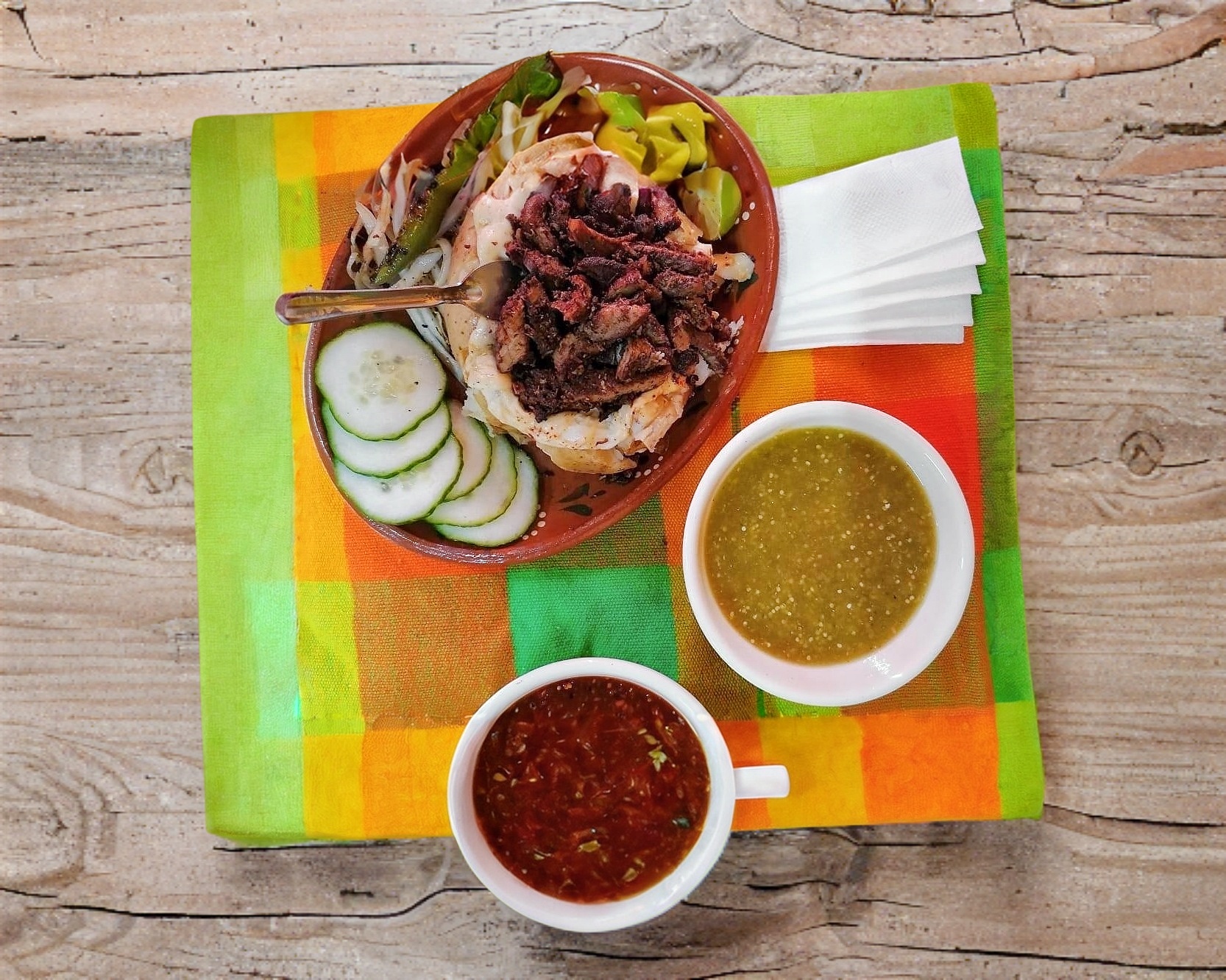 Con Queso, cebollitas asadas, Chile asado, salsa verde, roja o guacamole, cebolla, cilantro y limones
