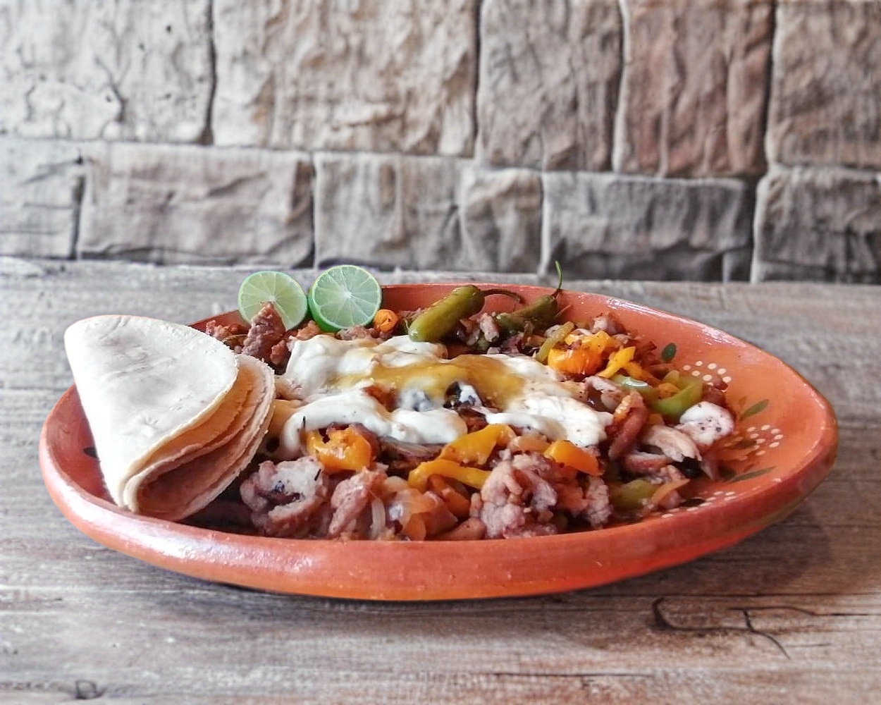 Con Queso, cebollitas asadas, chile asado, salsa verde, roja o guacamole, cebolla, cilantro y limones.