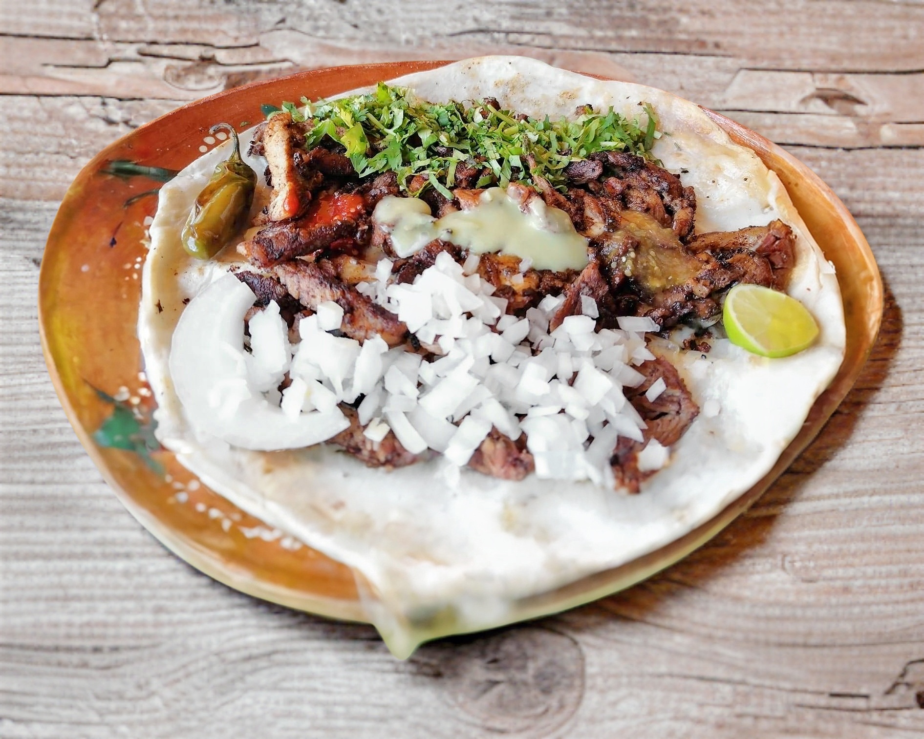tortilla de harina burrera, cebollitas asadas, chile asado, salsa verde, roja o guacamole, cebolla, cilantro y limones.