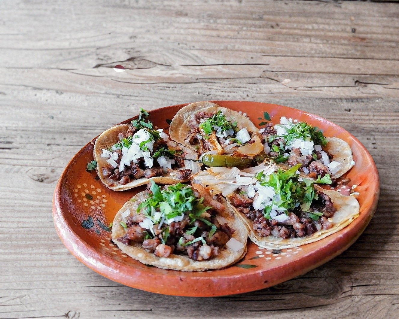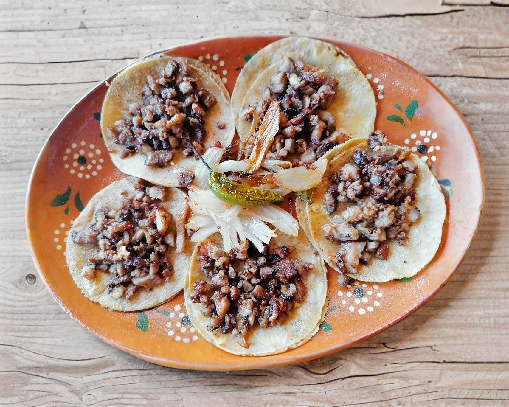 TOCINETA DE CERDO, CEBOLLITAS Y CHILE ASADO, SALSA VERDE. ROJA o GUACAMOLE, CEBOLLA YCILANTRO