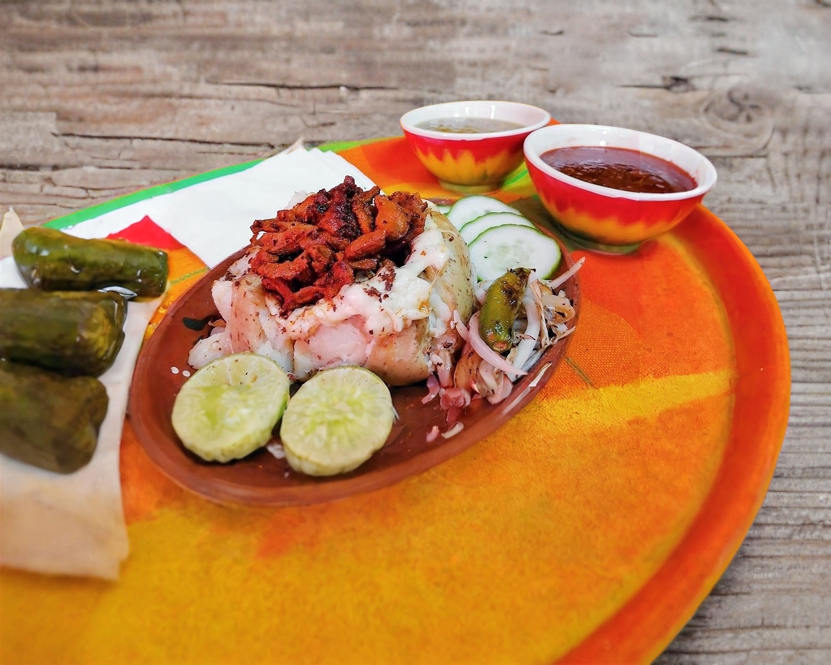 queso, carne, matequilla en una papa asada acompañada de cebollitas asadas, chile asado, limones, salsa verde, roja y guacamole.