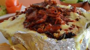 Papa con matequilla y carne de bistec con queso (acompañado de tortillas de maíz).