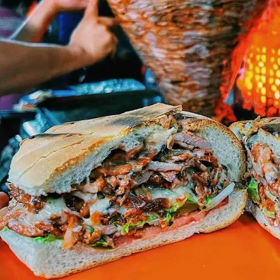 Torta combinada de bistec y Pastor con queso asadero, mayonesa, lechuga, aguacate y jitomate.