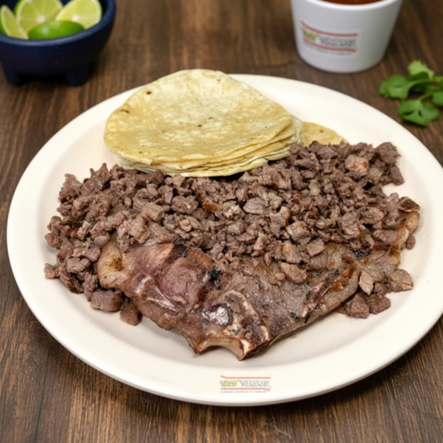 Un platillo bien elavorado, preparado con carne de pastor, bistec, chuleta, tocino, cebolla, chile morrón queso y aguacate (Incluye tortillas de maíz)