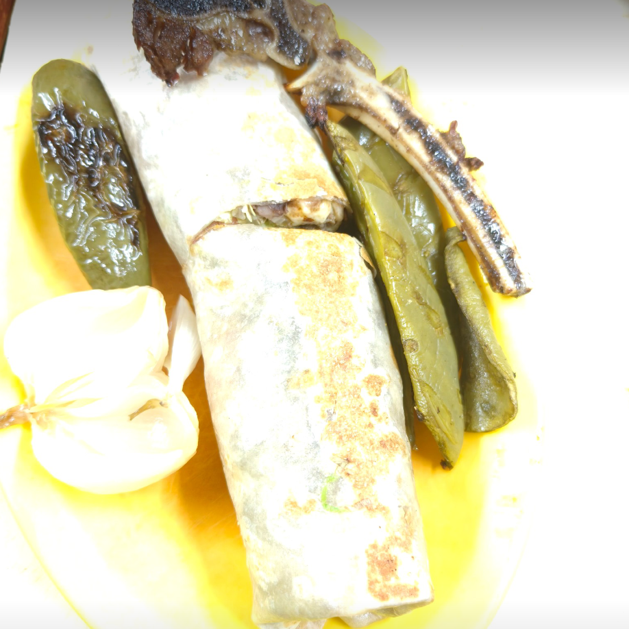 Burrito estilo mexicano de pastor y bistec. Hecho con tortilla de harina, frijoles refritos, lechuga, aguacate, jitomate, queso chile asado.