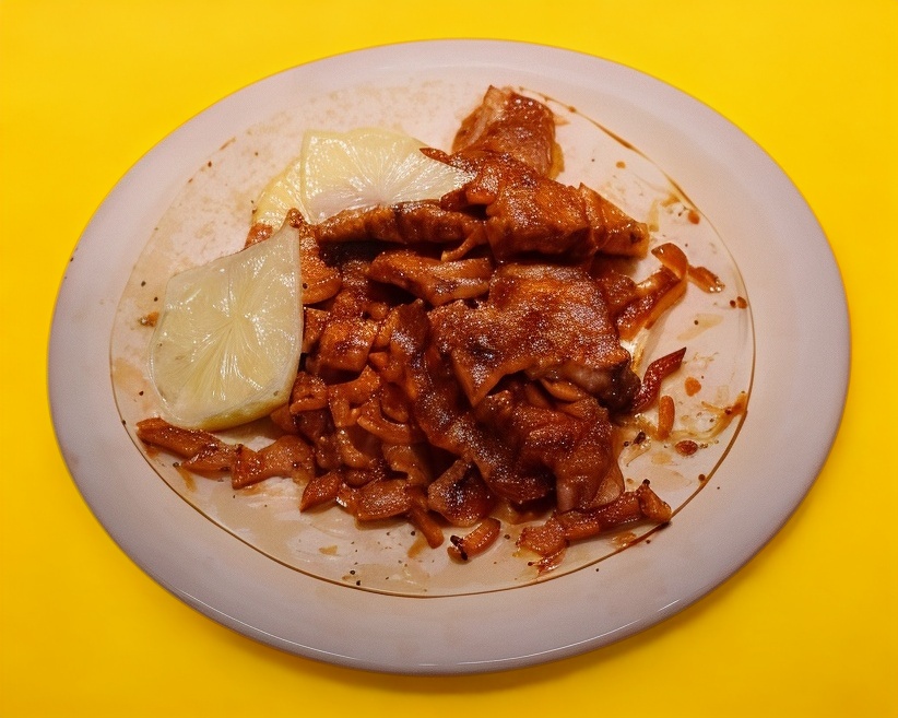 Carne de pollo, tocino, pimiento morrón, cebolla, acompañada con tortillas de maíz.