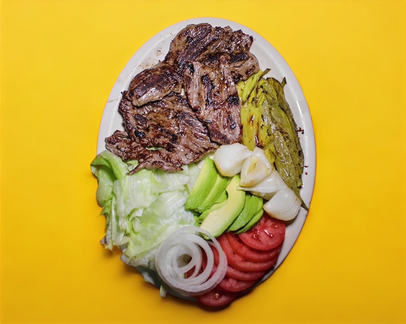 Carne de bistec asada, acompañada de ensalada de lechuga, jitomate, cebolla, aguacate, Chile güero, cebollitas asada y tortilla de maíz.