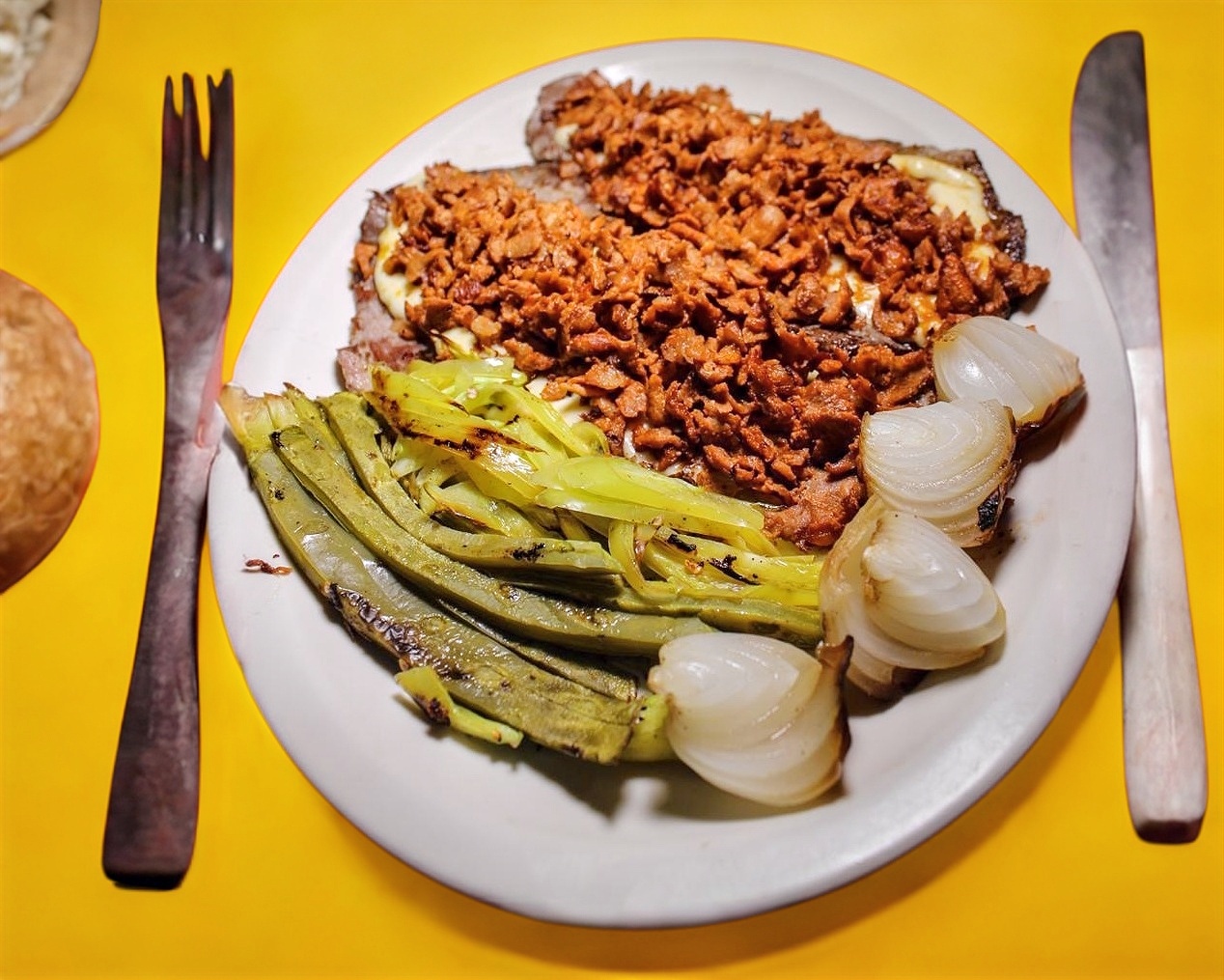 2 tiras de carne de res, con queso y pastor encima. Acompañado con chile güero, nopales y tortillas de maíz.
