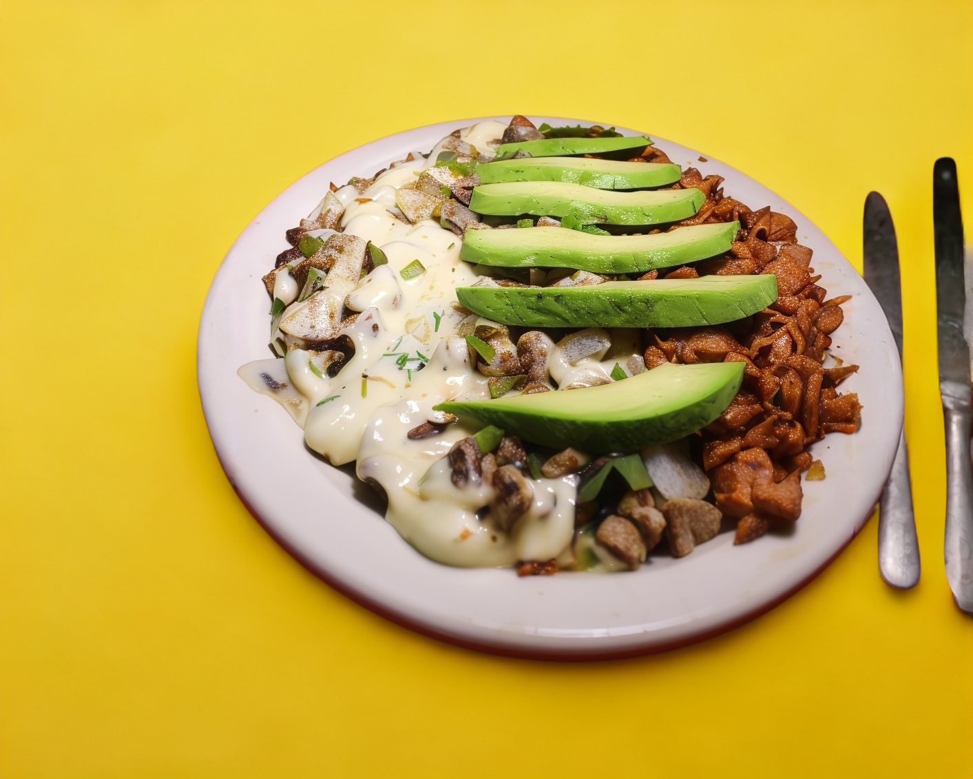 Mitad del platillo lleva carne de pastor, la otra mitad lleva carne de bisteck, tocino, pimiento morrón, cebolla, acompañada con tortillas de maíz y 3 rebanadas de aguacate.