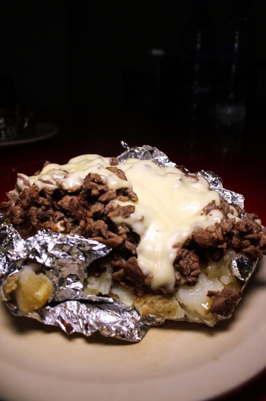 Papa asada envuelta en aluminio con carne de bistec, queso y acompañada con tortillas de maíz.