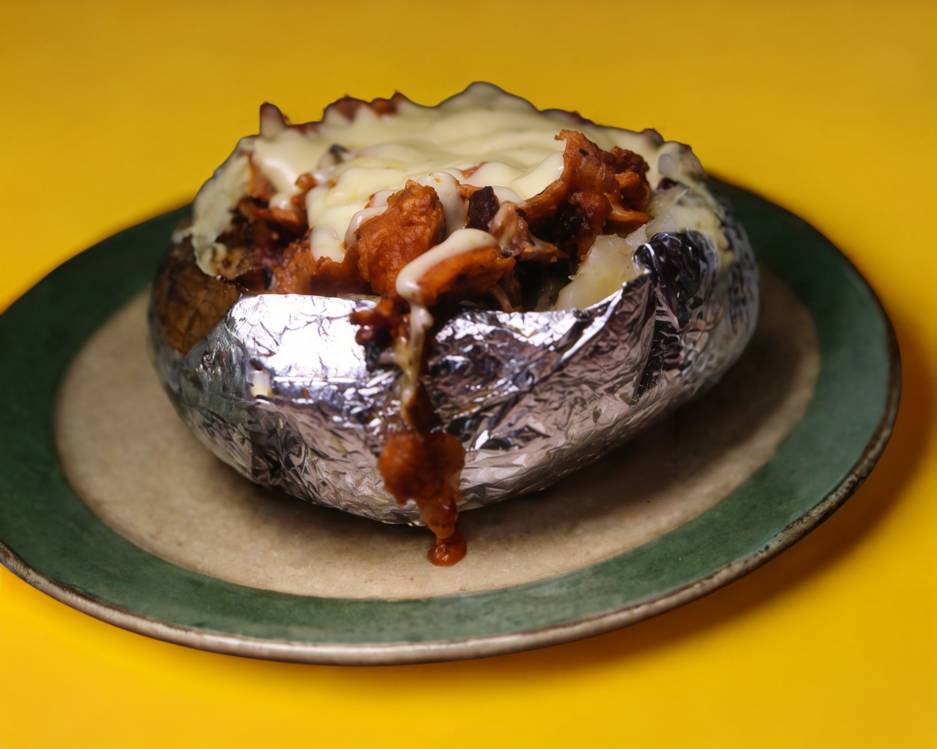Papa asada envuelta en aluminio con carne de pastor, queso y acompañada con tortillas de maíz.