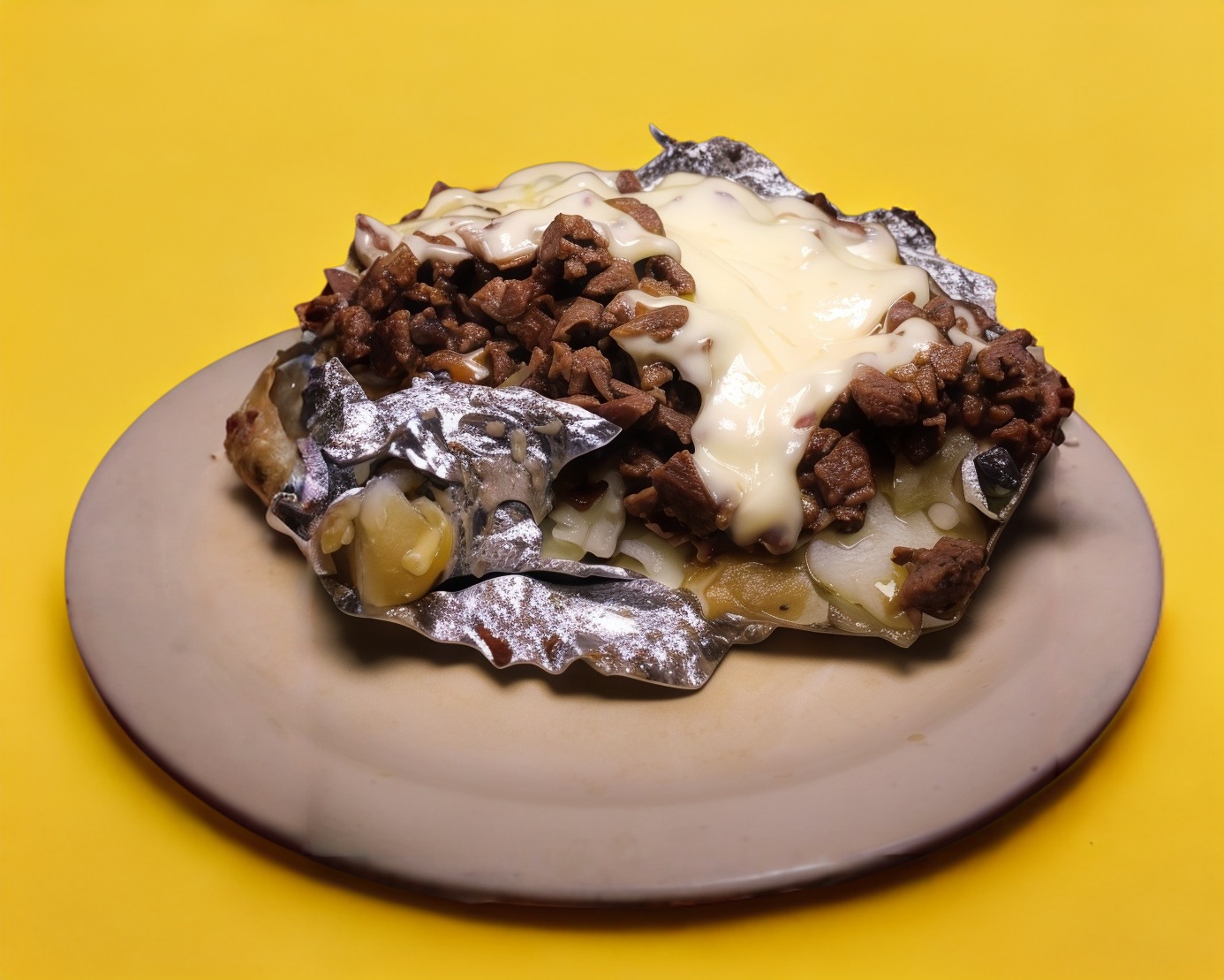 Papa asada envuelta en Aluminio con Carne de arrachera, queso y acompañada con tortillas de maíz.