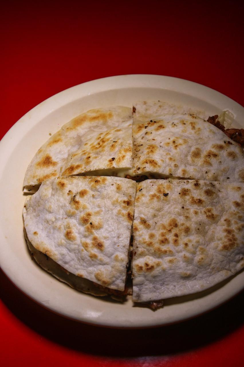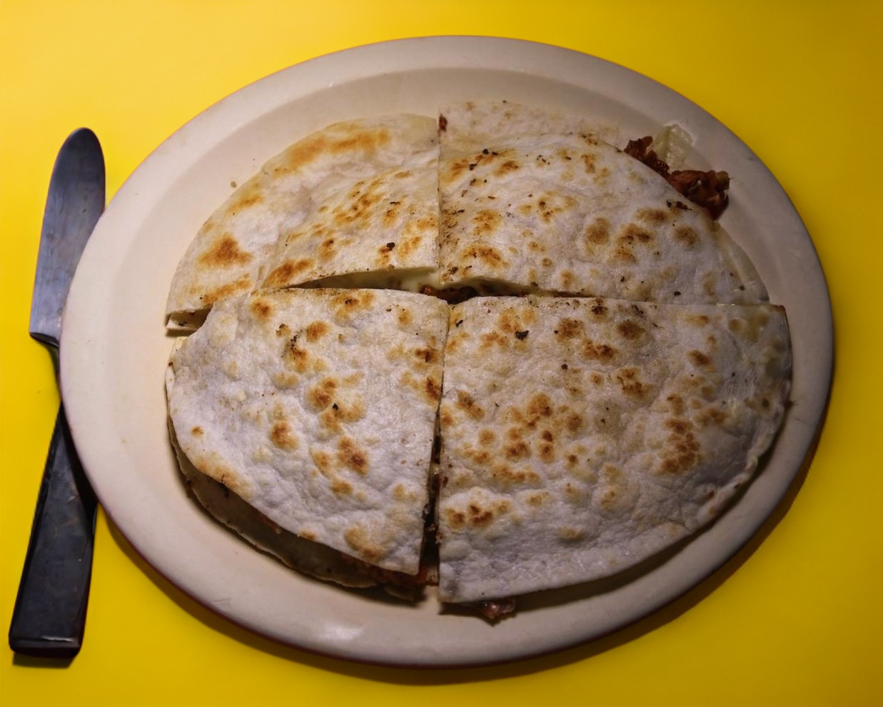 Dos tortillas de harina en medio lleva carne de bistec y queso partido en 4 pequeñas porciones.