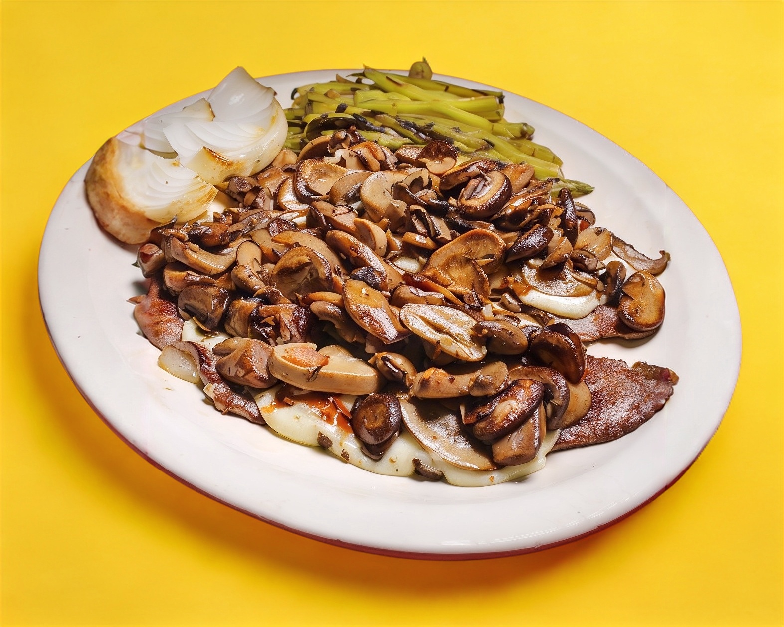 2 tiras de carne de res, con queso y champiñones encima. Acompañado con chile güero, nopales y tortillas de maíz.