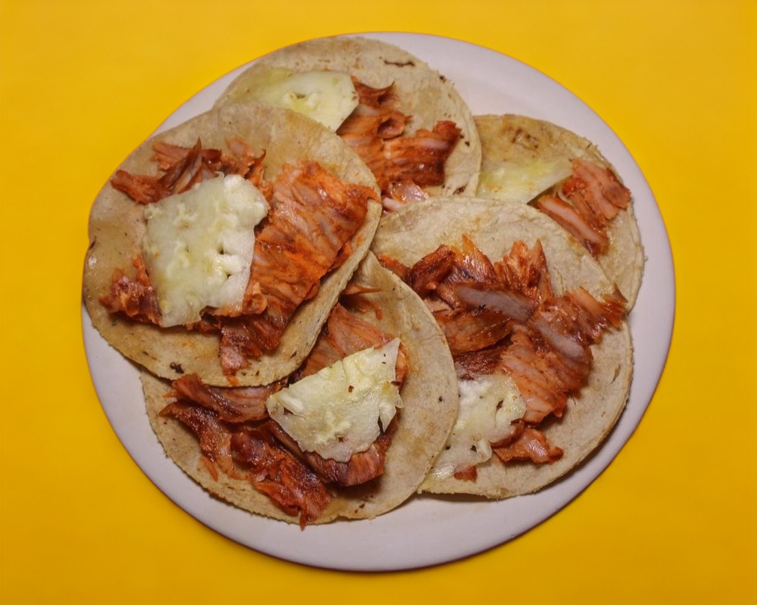 Carne de pastor, queso, tocino, pimiento morrón, cebolla, acompañada con tortillas de maíz.