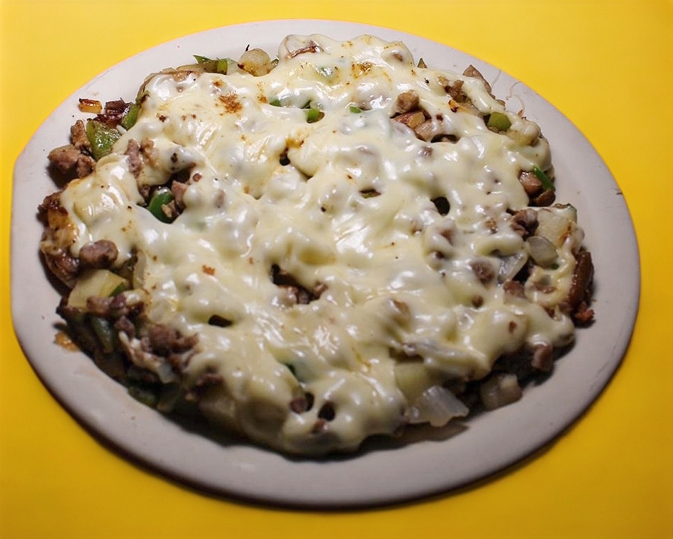 Carne de bistec, queso, tocino, pimiento morrón, cebolla, acompañada con tortillas de maíz.